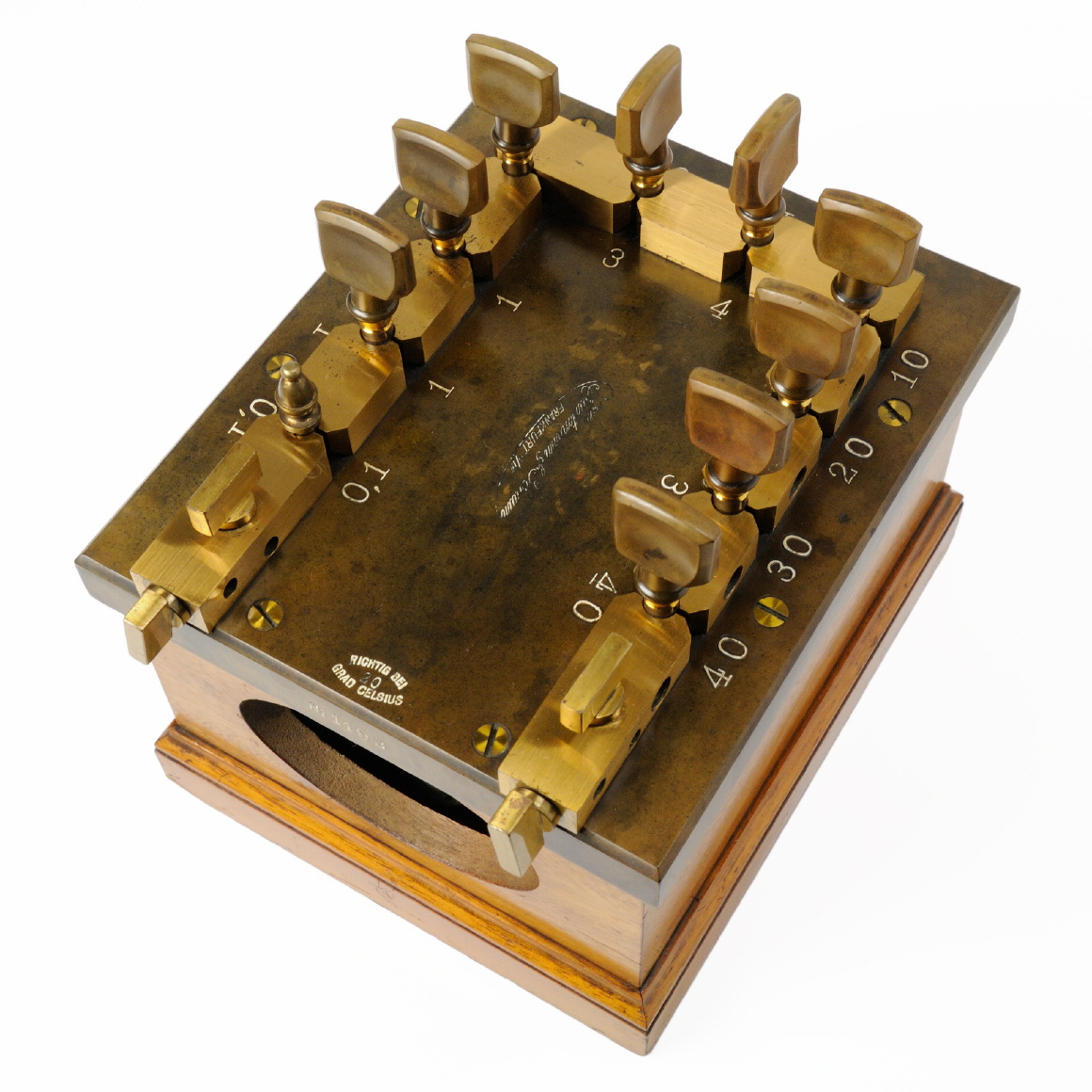 Der Rheostat besteht aus einer Reihen von Widerständen, die über Messing-Brücken in Reihe geschaltet sind. Durch Stecken der Stöpsel können einzelne Widerstände überbrückt werden, dadurch können nahezu beliebige Widerstandswerte zwischen 0,1 Ohm und 111,1 Ohm eingestellt werden.