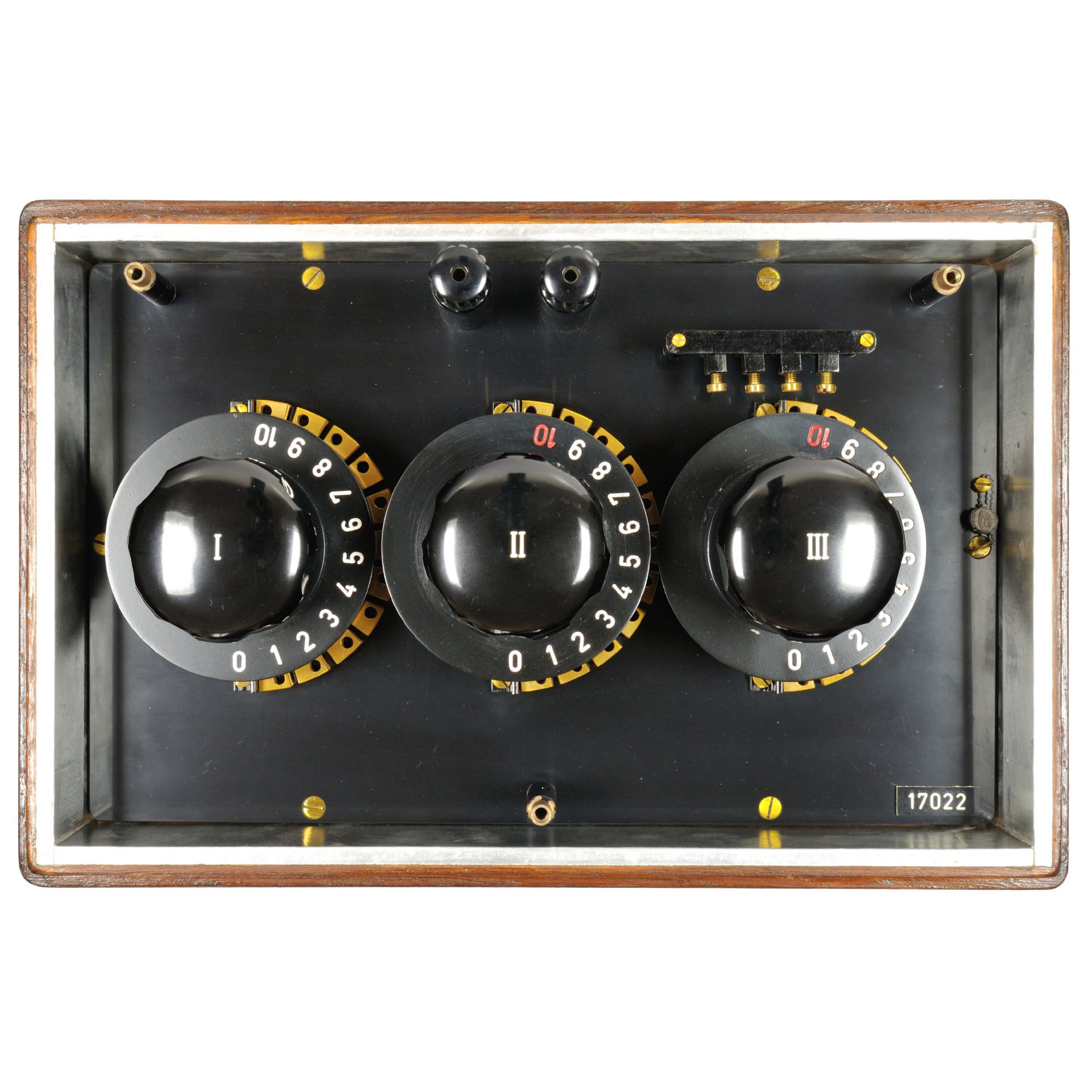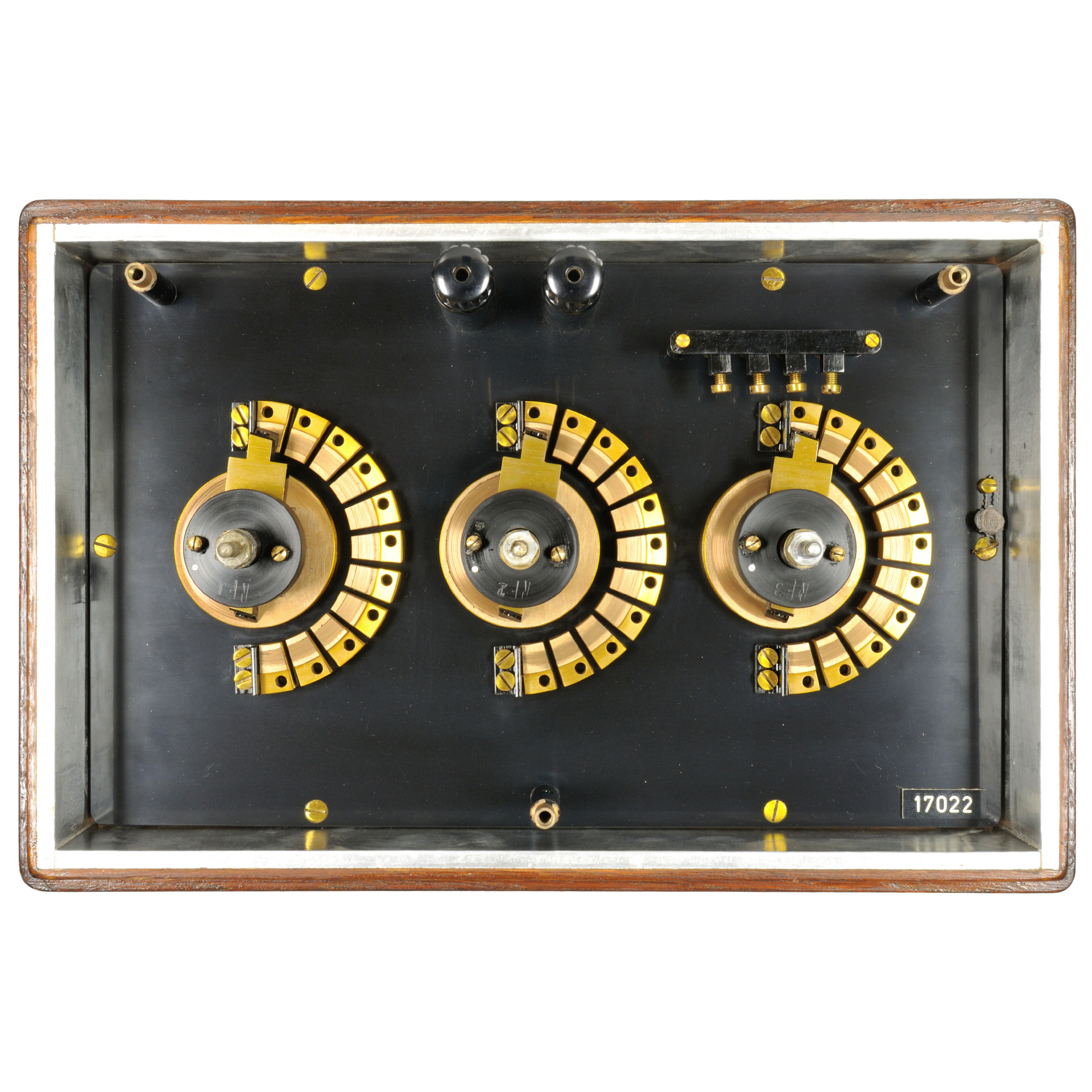 Der Rheostat besteht aus 3 Dekaden-Kurbeln (siehe unten), die auf einer Kunststoff-Platte (ggf. Hartgummi) montiert sind. Im Inneren des Gehäuses befinden sich die Widerstände. Die Kurbeln schleifen mit Messing-Federkontakten über Kontaktklötzen, der Übergangswiderstand wird dadurch auf ein Minimum reduziert. Die Anschlußklemmen sind auf der Oberseite des Geräts herausgeführt und eignen sich auch für übliche 4mm Laborstecker. Entgegen früherer Konstruktionen der Firma kann der Deckel im Betrieb nicht mehr geschlossen werden, um die Schaltkontakte von Verunreinigungen zu schützen sind diese unter einer einfach abbaubaren Aluminiumplatte geschützt. Der Holzkasten ist innen vollständig mit Aluminium ausgekleidet, zusätzlich findet sich noch eine weitere Anschlußklemme zur Erdung des Metallteile. Der Deckel hat auf der Unterkante eine Filzauflage, die das Gehäuse dicht abschließt. Das Holzgehäuse besitzt unten Gummifüße für einen besseren Stand und hat zusätzlich auf den Seiten eingearbeitete Griffmulden für einen einfacheren Transport. |