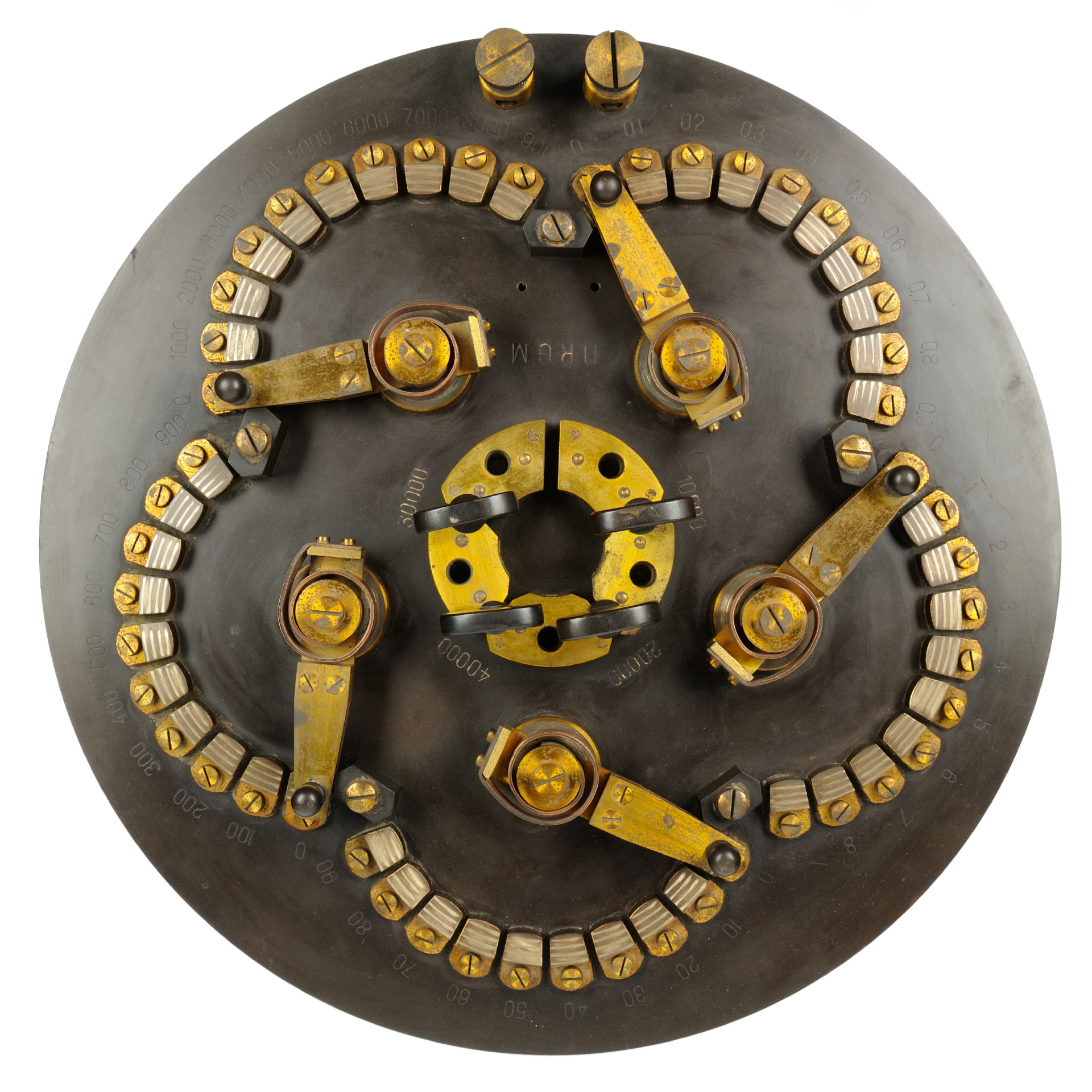 Präzisions-Kurbelwiderstand mit Manganindrahtwicklung auf Metallrollen und mit Abzweigschrauben für jede Kontaktstufe; Listen-Nr. 16933 |