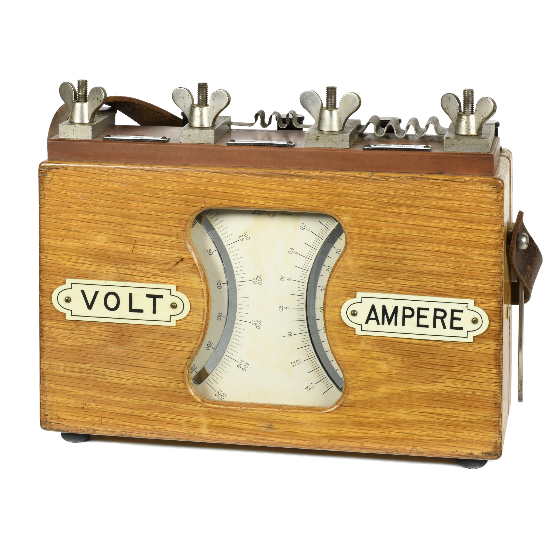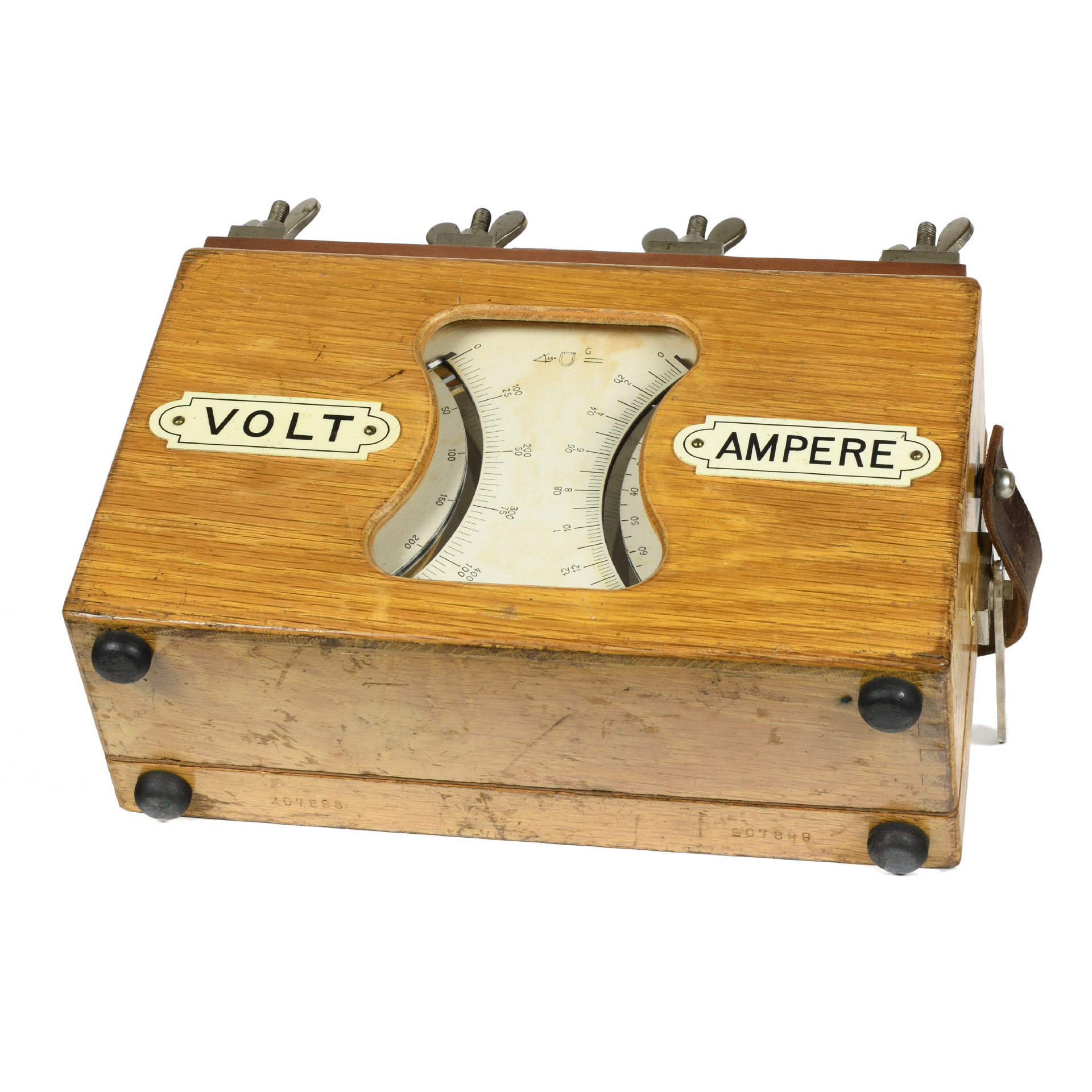 Das Mehrfachmessgerät ist als tragbares Gerät ausgeführt. Die beiden Messwerke sitzen in einem Holzgehäuse mit Lederriemen. Die Stromanschlüsse sind oben am Gerät als massive Schraubklemmen (Flügelmuttern) auf einer braunen Isolierstoff-Platte ausgeführt, die nicht direkt mit dem Messwerk verbunden sind. Über kleine Drahtbrücken müssen diese erst an die dahinterliegenden Schraubklemmen "A" angeschlossen werden, dazu finden sich an den äußeren Messing-Klötzen jeweils Schrauben zum Anschluss der Drähte. Die Spannungsanschlüsse liegen ebenfalls hinter den Stromklemmen. Über zwei Standfüße (rechts und links) kann das Gerät in einer 45° Neigung betrieben werden. Die Rückseite des Geräts besitzt eine gelochte Blechplatte zur Belüftung. Eine weitere konstruktive Besonderheit an dem Gerät ist, dass das Holzgehäuse aus zwei Teilen besteht - im vorderen Teil sitzen die Messgeräte, im hinteren Teil die Vor- und Nebenwiderstände. Die Nullpunktkorrektur der Messwerke befindet sich auf der rechten und linken Seite des Gerätes. |