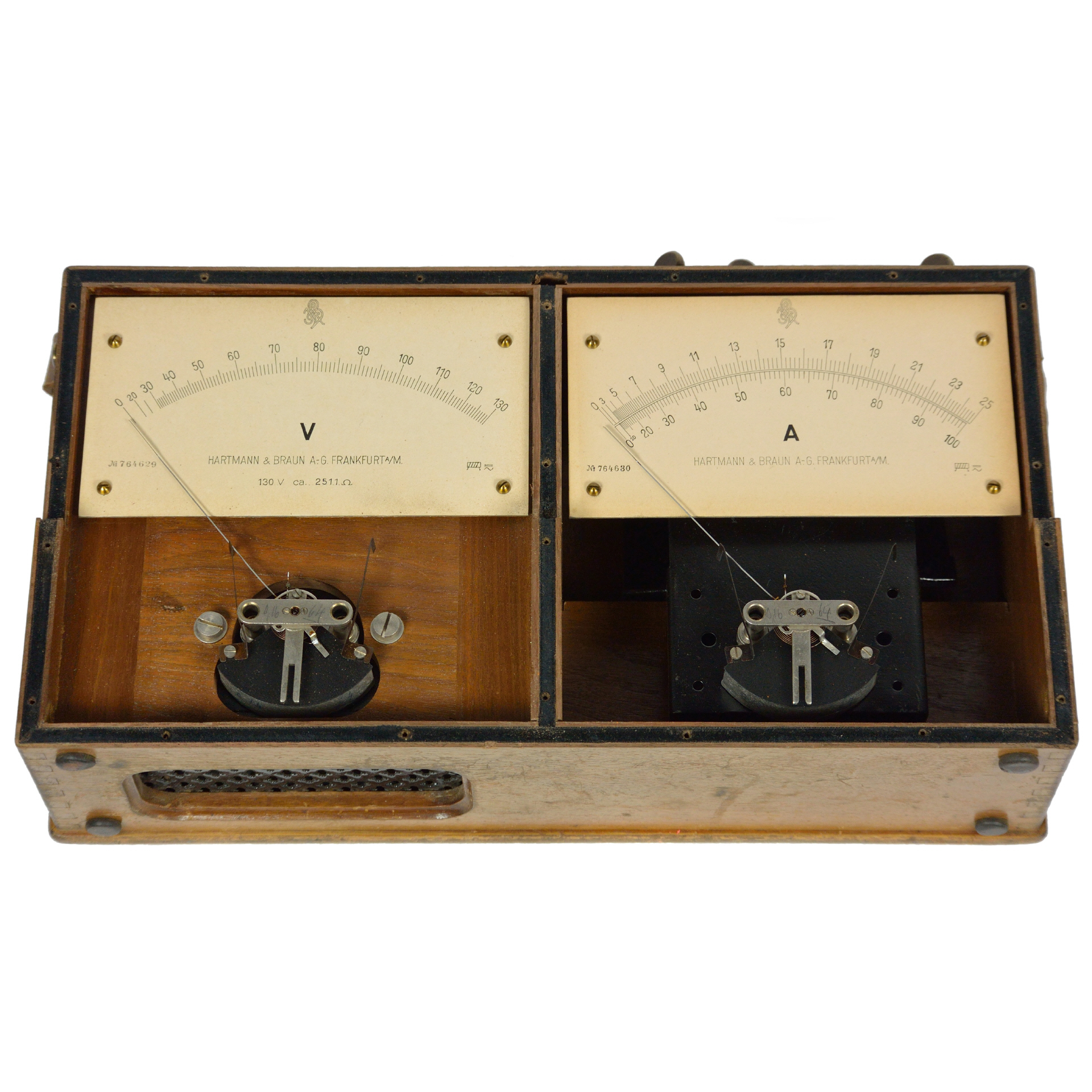 Das Mehrfachmessgerät ist als tragbares Gerät ausgeführt. Die beiden Messwerke sitzen in einem Holzgehäuse mit Lederriemen. Die Strom- und Spannungsanschlüsse sind oben am Gerät als Schraubklemmen ausgeführt. Der linke Teil des Messgeräts (Spannungsmessung) besitzt auf Ober- Unter- und Rückseite gelochte Bleche zur Belüftung. Die Skalen sind über eine Holzklappe verschlossen werden, auf der Innenseite dieser Klappe befindet sich auch die Anschaltanweisung. Die Nullpunktkorrektur der Messwerke befindet sich auf der Vorderseite des Gerätes. |