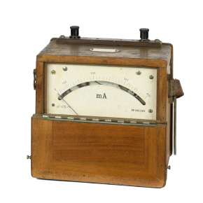 Das Milliamperemeter ist als tragbares Gerät ausgeführt. Das Messwerk sitzt in einem Holzgehäuse mit Lederriemen. Die Skala ist verschließbar (zwei Riegel auf den Seiten). Die Stromanschlüsse sind oben am Gerät als Schraubklemmen auf einer braunen Isolierstoff-Platte ausgeführt. Über zwei Standfüße (rechts und Links) kann das Gerät in einer 45° Neigung betrieben werden. Die Rückseite des Geräts besitzt eine gelochte Blechplatte zur Belüftung. Eine weitere konstruktive Besonderheit an dem Gerät ist, dass das Holzgehäuse aus zwei Teilen besteht - im vorderen Teil sitzen die Messgeräte, im hinteren Teil die Vor- und Nebenwiderstände. Die Nullpunktkorrektur des Messwerks befindet sich auf der Unterseite des Gerätes. |