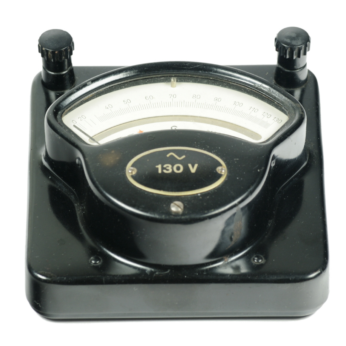 Spannungsmesser mit Dreheisenmeßwerk für Frequenzen bis 100 Hz; Skalenbezifferung 0 ... 130; Unterteilung beginnt bei 30, danach nahezu proportionale Skala; Stromverbrauch bei Nennspannung 30 mA; Meßbereich 130 V; Messgenauigkeit: ± 1% |