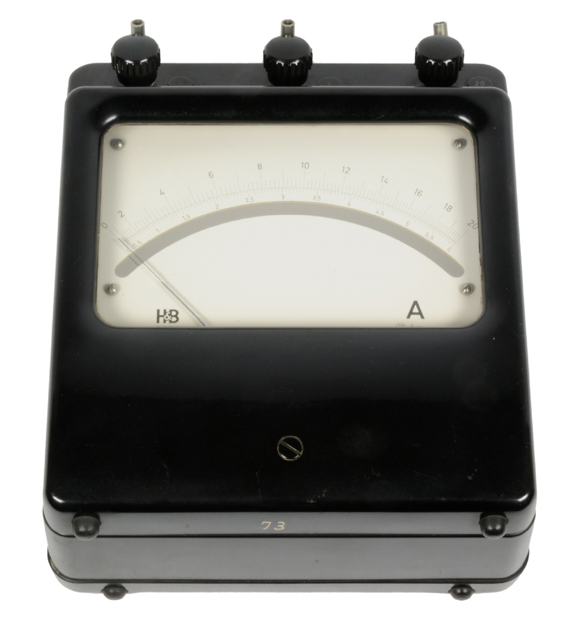 Das Gerät besitzt ein Kunststoff-Gehäuse aus schwarzem Pressstoff und ist für den waagerechten Betrieb ausgelegt. Die Skala ist als Spiegelskala ausgeführt mit einer nicht-linearen Unterteilung von 0 ... 20 bzw. 0 ... 6. Über drei Schraubklemmen (mit zusätzlicher Lasche und 4 mm Buchse), wird das Meßobjekt angeschlossen (Klemme 0 & 6 - 6 A; 0 & 20 - 20 A Messbereich). |