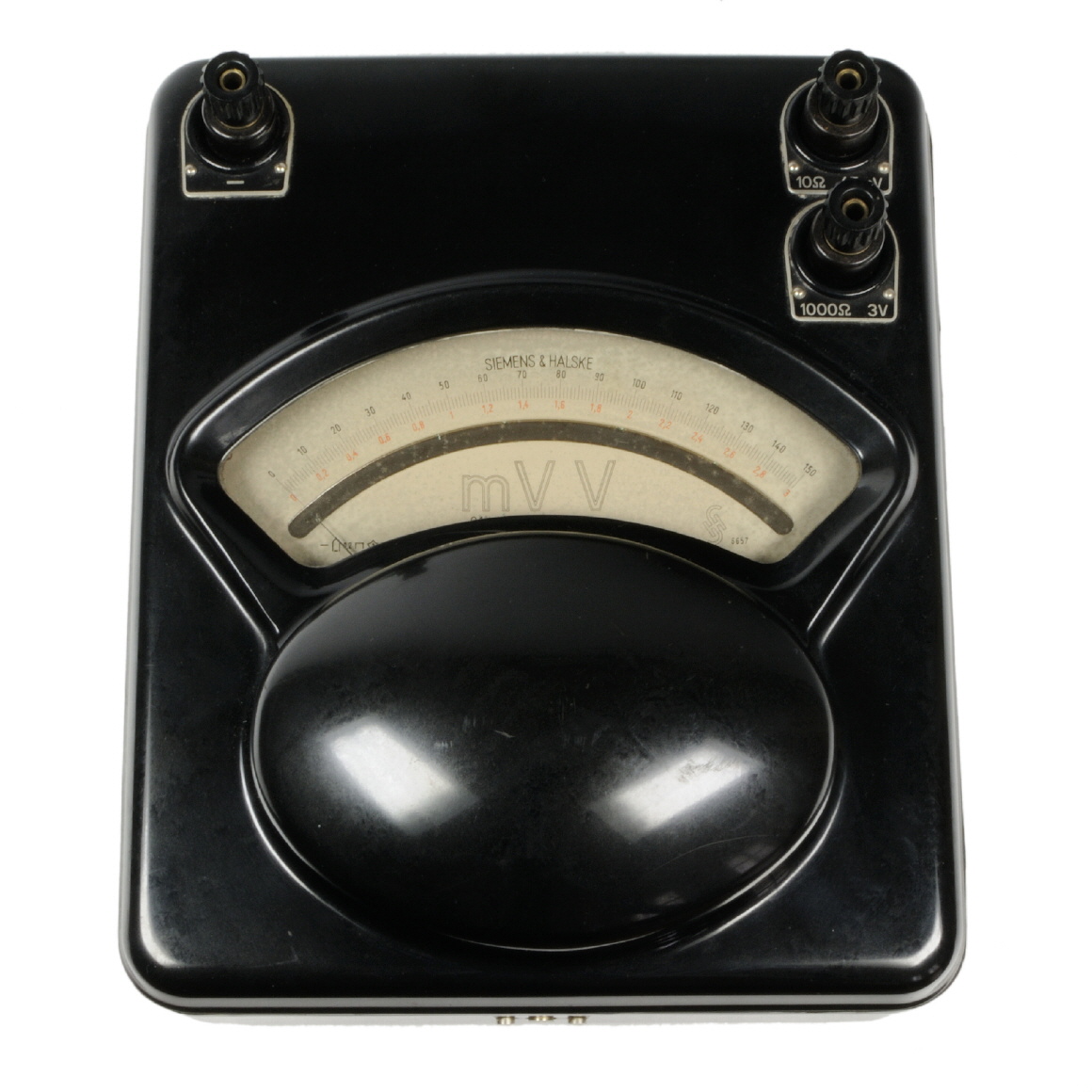 Auf dem Skalenblatt: Skalennummer: 3657; Skala 0-150, 0-3 (rot) Rechte Seite: Korrektur-Tabelle, datiert vom 24.9.56 Stirnseite: Aufkleber der Zentralverteilungsstelle Bayernwerke-AG (ohne lesbare Nummer) |