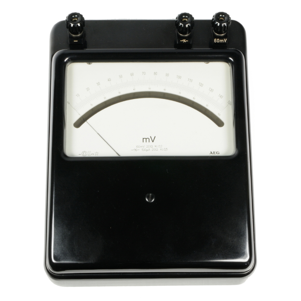 Präzisions Millivoltmeter (Drehspulmesswerk, nur Gleichstrom, 0,2%/0,5% Genauigkeit, 2 kV Prüfspannung; 60 mV, 150 µA, nur für waagrechte Lage geeignet) |