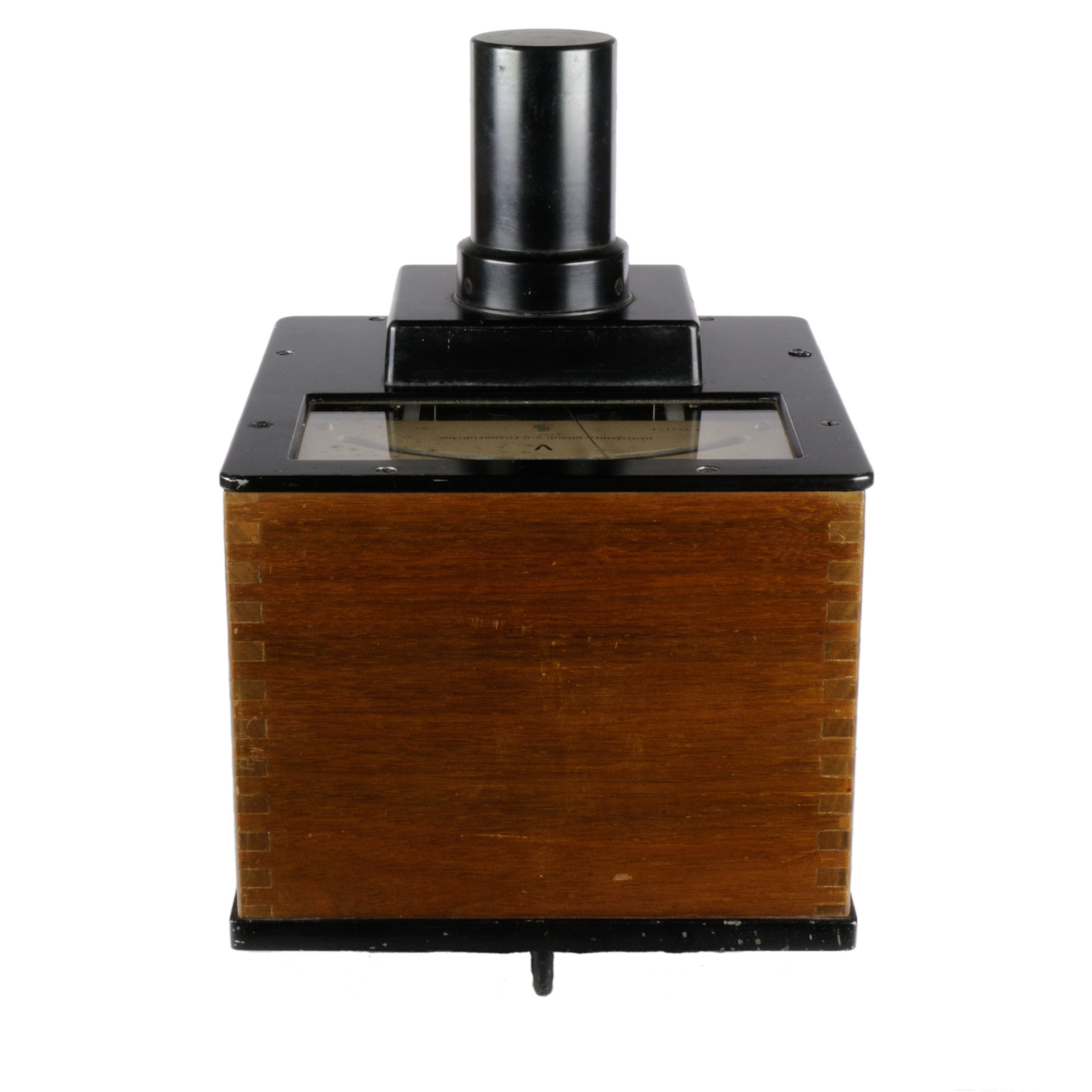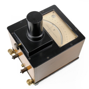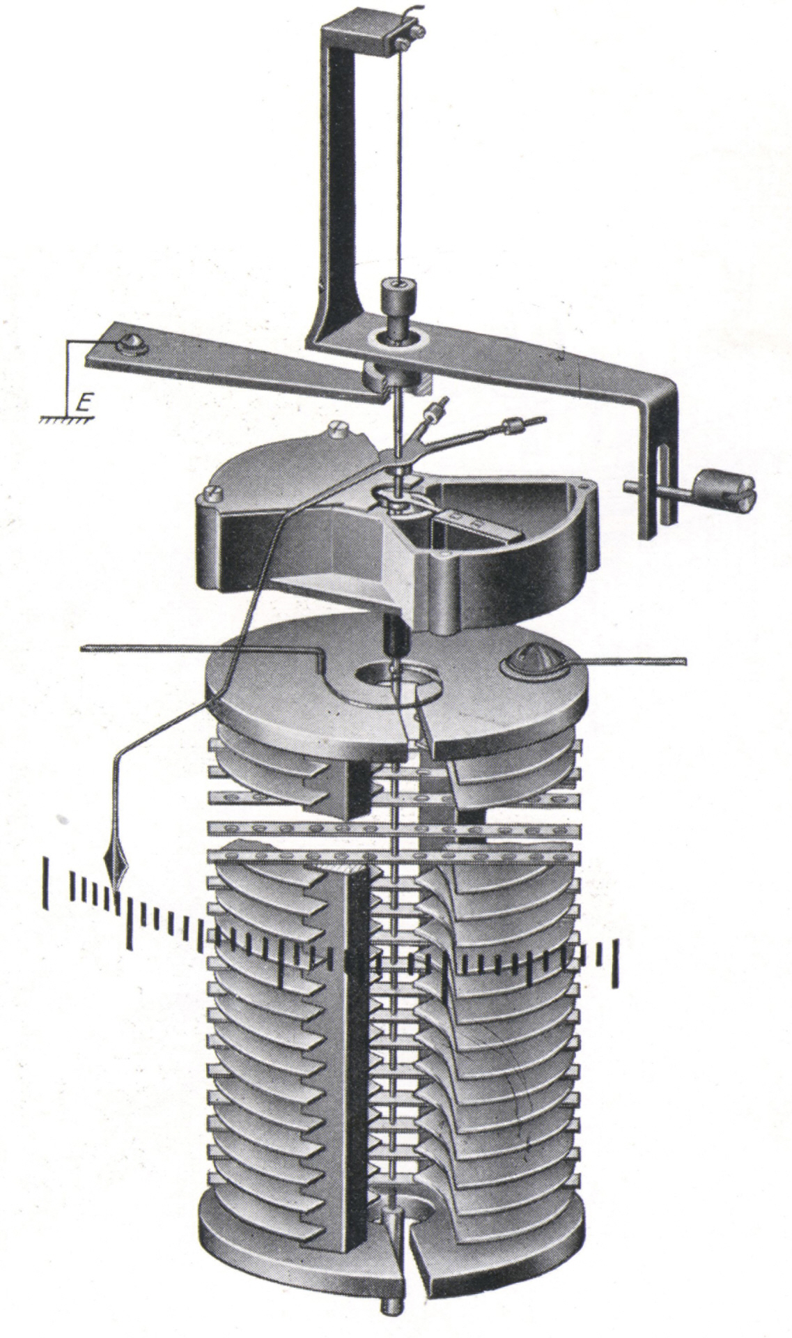 ) ist an einem Bronzeband aufgehängt, das als Gegenkraft dient. Auf einer langen Achse sind eine Anzahl Querstäbe gelagert, die in eine gleiche Anzahl feststehender Kammern einschwingen, durch deren Form die lineare Skale erreicht wird. Der aktive Teil des Systems ist vom Aufhängeband und Zeiger durch Bernstein isoliert. Die Stromzuführung erfolgt durch ein besonderes Band. Für den Transport wird das Messwerk arretiert. |