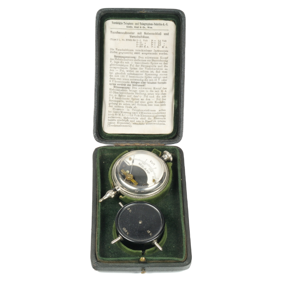 ![[00919] - Taschenvoltmeter mit Nebenschluß und Vorschaltdose - Type D; Vereinigte Telephon- und Telegraphen-Fabriks-A.G. Czelja, Nissel & Co., Wien; um 1910](../../../images/00919_at_vtvtf_tascheninstrument_gesamttable25.jpg)