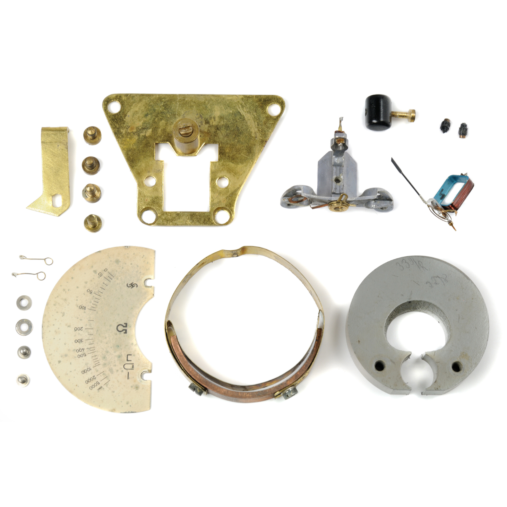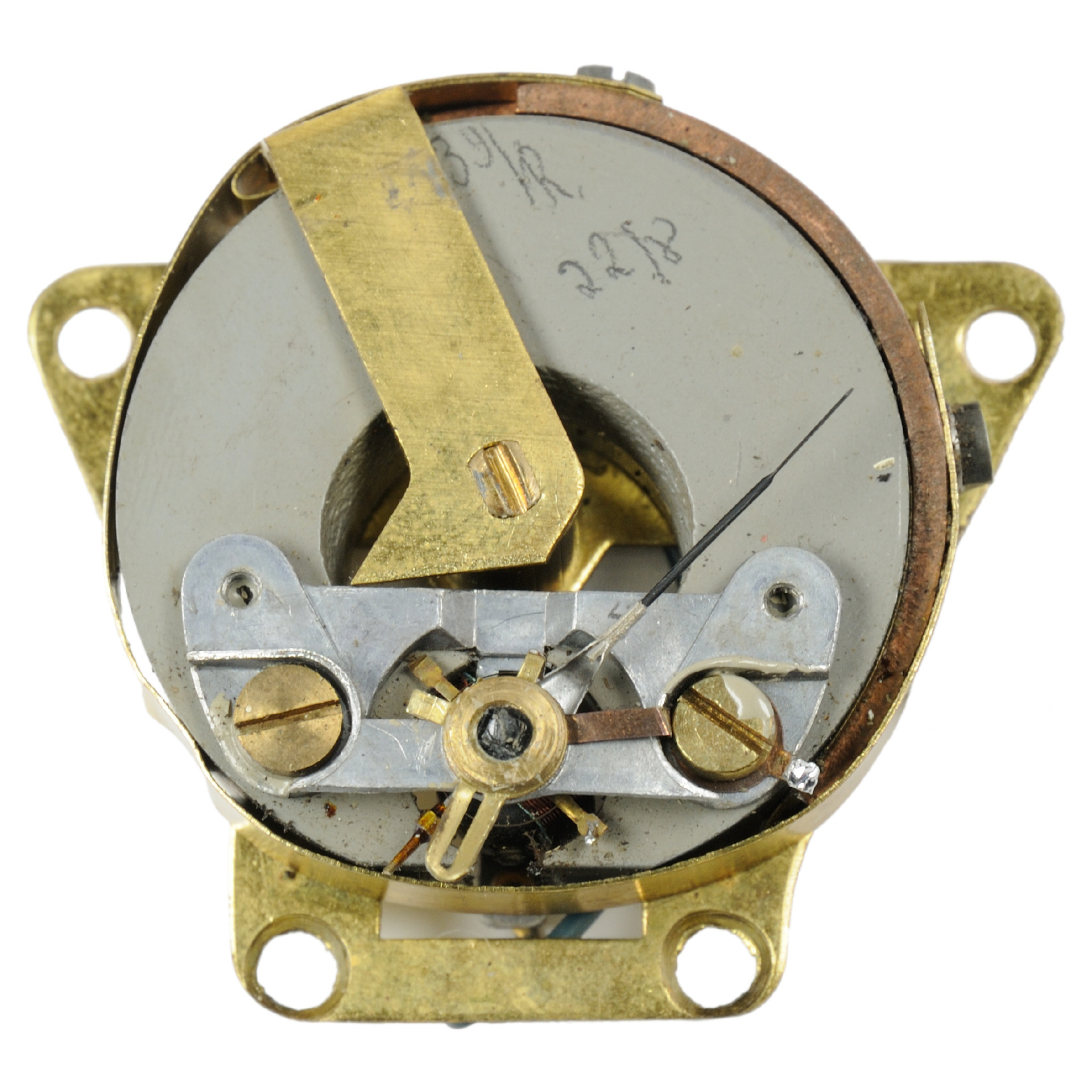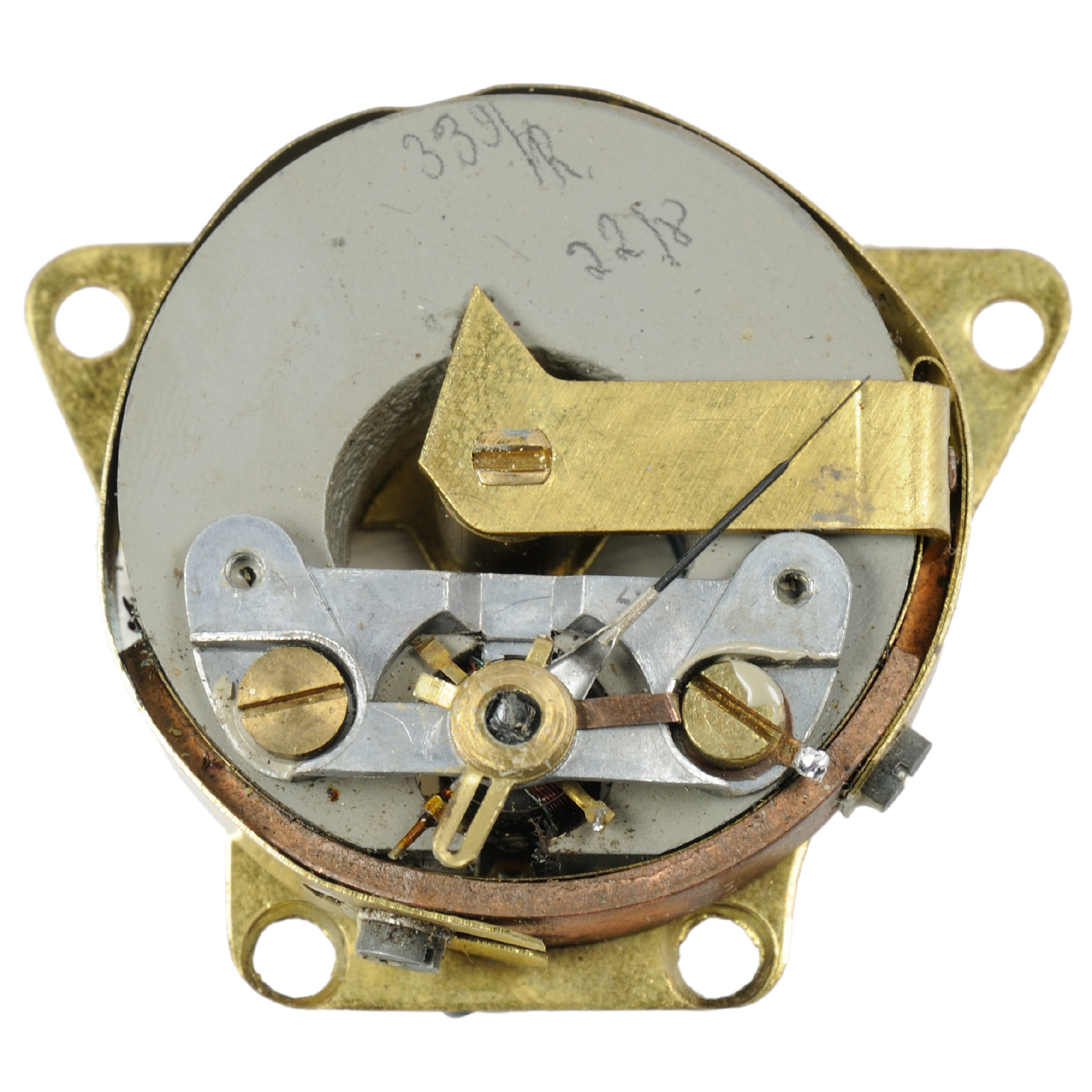 Das Messwerk ist ein Drehspul-Messwerk mit Spitzenlagerung und einstellbarem magnetischen Nebenfluß. die ersten beiden Aufnahmen zeigen die Verändung des magnetischen Nebenflusses in den beiden Endpositionen, in der dritten Aufnahme ist das Messwerk zerlegt.