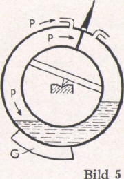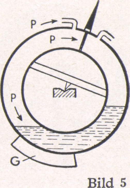 Auf die Meßgenauigkeit haben die Menge und das spezifische Gewicht der Füllflüssigkeit keinen Einfluß. Ist z. B. die Wasserfüllung zum Teil verdunstet (Bild 5), so wird nach wie vor durch den Druck P auf die Trennwand der Waagering gedreht, bis er durch das Gegengewicht in die Gleichgewichtslage kommt. Jedoch kann gegebenenfalls der obere Teil des Meßbereiches nicht mehr erfaßt werden, weil die Flüssigkeit, auf die der gleiche Druck P wirkt, vor Erreichen des Endausschlages durchgedrückt werden kann, so daß die Luft zur anderen Kammer durchströmt.