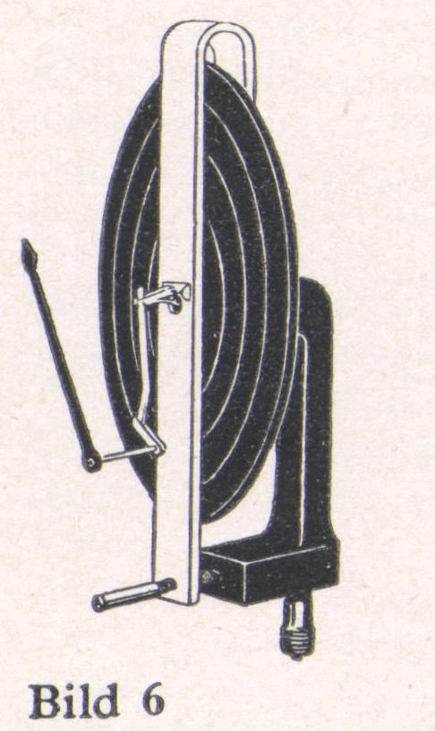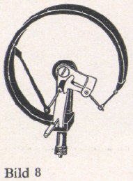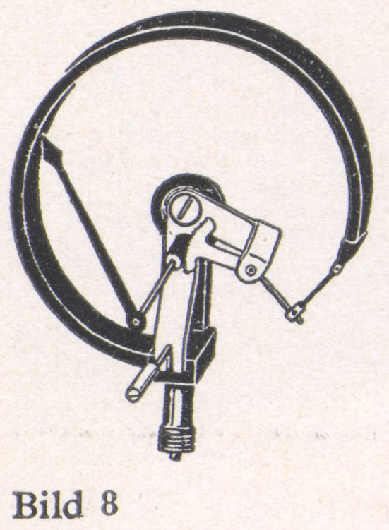 Das Rohrfeder-Meßwerk (Bild 8) zur Messung hoher und höchster Drücke bei Luft, Gasen, Dampf und Flüssigkeiten. Es besteht aus einem ringförmig gebogenen, einseitig geschlossenen Rohr. Die offene Seite zur Zuführung des Druckes ist fest eingespannt, die geschlossene beweglich. Die durch Druckänderung bewirkte Streckung der Rohrfeder ist ein Maß für den Druck.