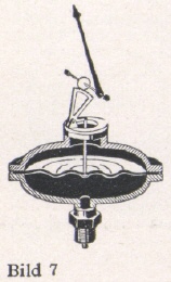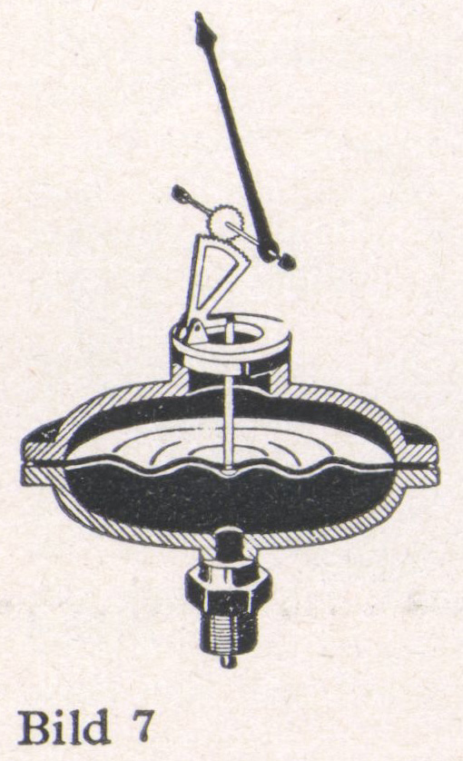 Das Plattenfeder-Meßwerk (Bild 7) zur Messung kleinerer und größerer Drücke und Unterdrücke bei Luft, Gasen, Dampf und Flüssigkeiten. Es besteht aus einer gewellten, zwischen zwei Flanschen eingespannten Metallmembran. Die vom Meßdruck hervorgerufene Durchbiegung ist ein Maß für den Druck.
