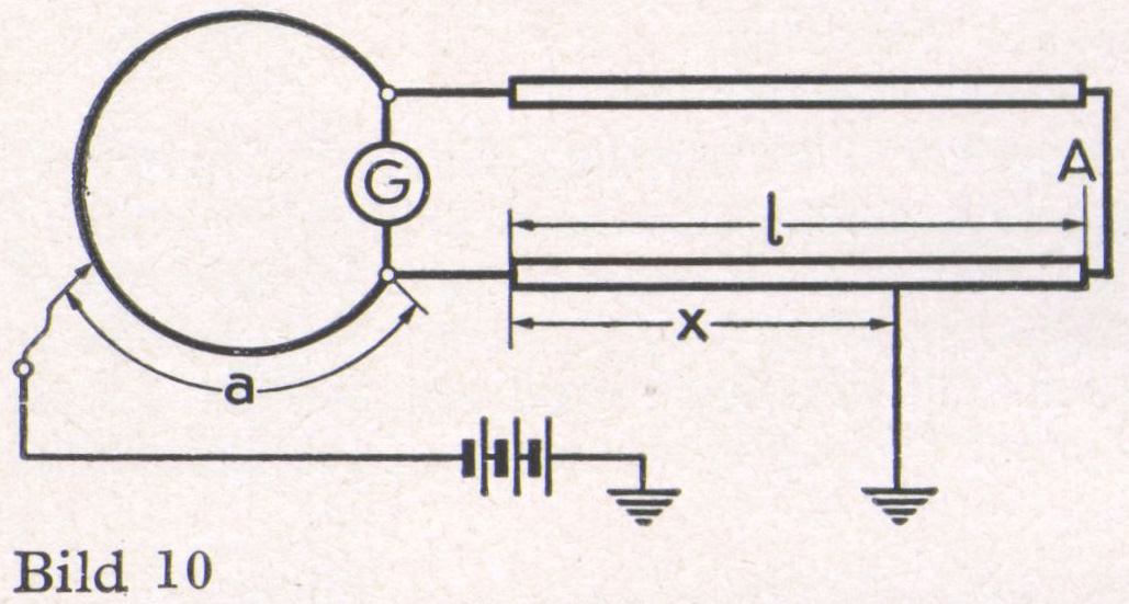 Der Reihe nach werden die Kabellängen x und 2 1 — x mit der Spannung U geladen und über das ballistische Galvanometer entladen. Die ballistischen Ausschläge a1 und a2 verhalten sich wie die Längen der entsprechenden Kabelstücke (vergl. auch ballistisches Galvanometer).