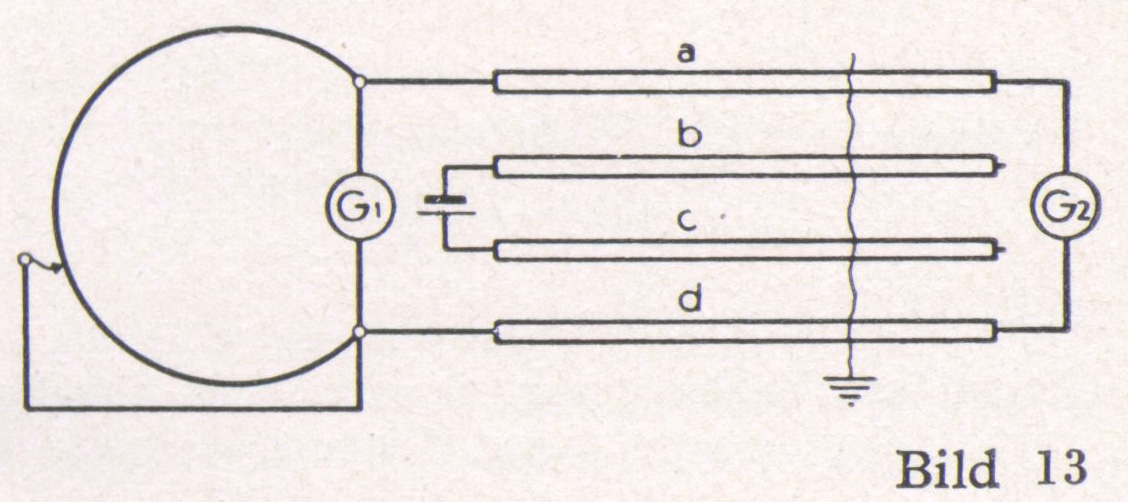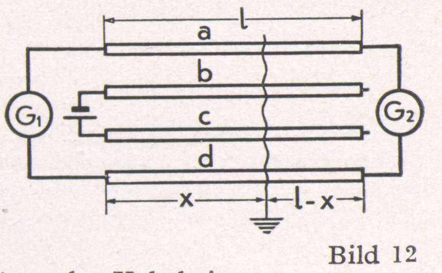 In die zwei Adern b und c (Bild 12) wird Gleichstrom geschickt, von dem ein Teil über die Erdwiderstände in die beiden Adern a und d eindringt und sich in diesen nach beiden Seiten im umgekehrten Verhältnis ihrer Widerstände verzweigt. Der eine Zweigstrom fließt durch das Galvanometer G1 der andere durch G2. Haben beide Galvanometer gleiche Empfindlichkeit, und sind a1 und a2 die Zeigerausschläge, so ergibt sich, wenn l die Gesamtlänge des Kabels ist: