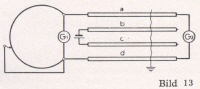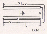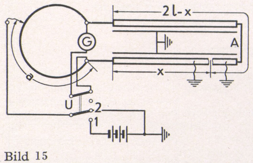 Die gebrochene Ader wird mit einer gesunden Ader bei A verbunden, die Meßbrücke an die beiden offenen Enden angeschlossen (Bild 14). Auf Stellung 1 des Umschalters U werden die beiden Kabelstücke x und 2 l - x geladen, auf Stellung 2 entladen.