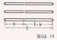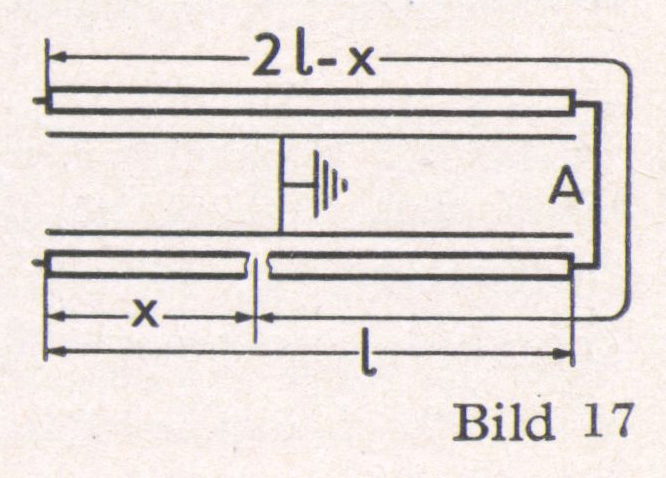 Die gebrochene Ader wird mit einer gesunden Ader bei A verbunden (Bild 17). Gemessen werden die Kapazitäten gegen Erde von x (= Ci) und von 2 1 — x (= C2). Da die Leitungslängen verhältnisgleich den Kapazitäten sind, ergibt sich: