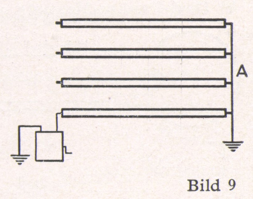 Alle Adern des Kabels werden bei A geerdet (Bild 9). Der Reihe nach werden sie mit einem Isolationsprüfer, z. B. mit einem Kurbelinduktor (siehe Kurbelinduktor) auf Stromdurchgang geprüft. Ist der Widerstand einer Ader ∞ oder sehr hoch, so ist mit Sicherheit Aderbruch vorhanden.