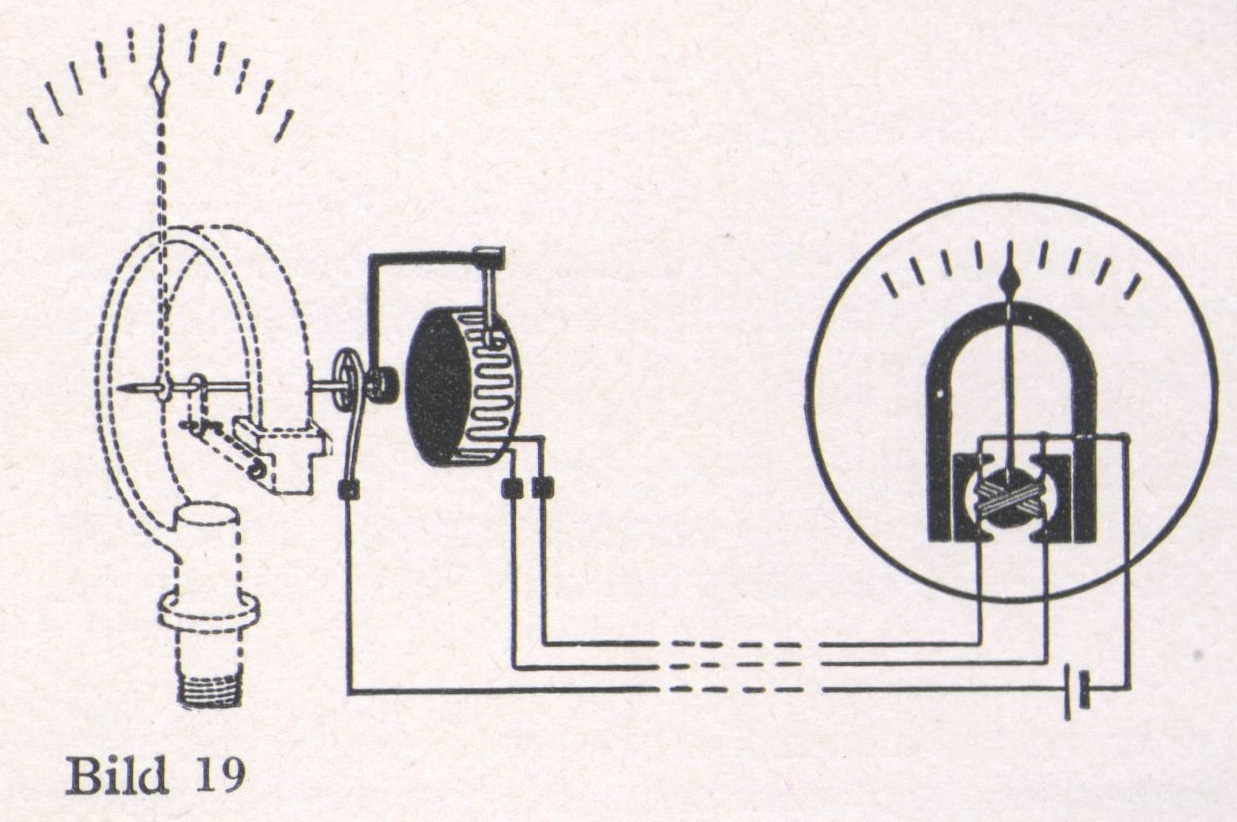 Bild 19 zeigt das Prinzip der elektrischen Fernübertragung durch Widerstands- Fernsender. Mit der Zeigerachse des Meßgerätes (in diesem Fall eines Rohrfeder - Druckmessers) ist ein Stromabnehmer gekuppelt, der auf einer feststehenden Wicklung aus Widerstandsdraht schleift. Die Wicklung wird dadurch in zwei Widerstandszweige geteilt, die sich entsprechend der jeweiligen Zeigerstellung ändern. Als Empfangsgerät wird ein Kreuzspulgerät angeschlossen, das auf das Verhältnis der Teilströme in den beiden Widerstandszweigen anspricht. Jede Drehung der antreibenden Achse wird so praktisch ohne Verzögerung genau übertragen. Die Übertragung kann über große Entfernungen (bis etwa 50 km) erfolgen.