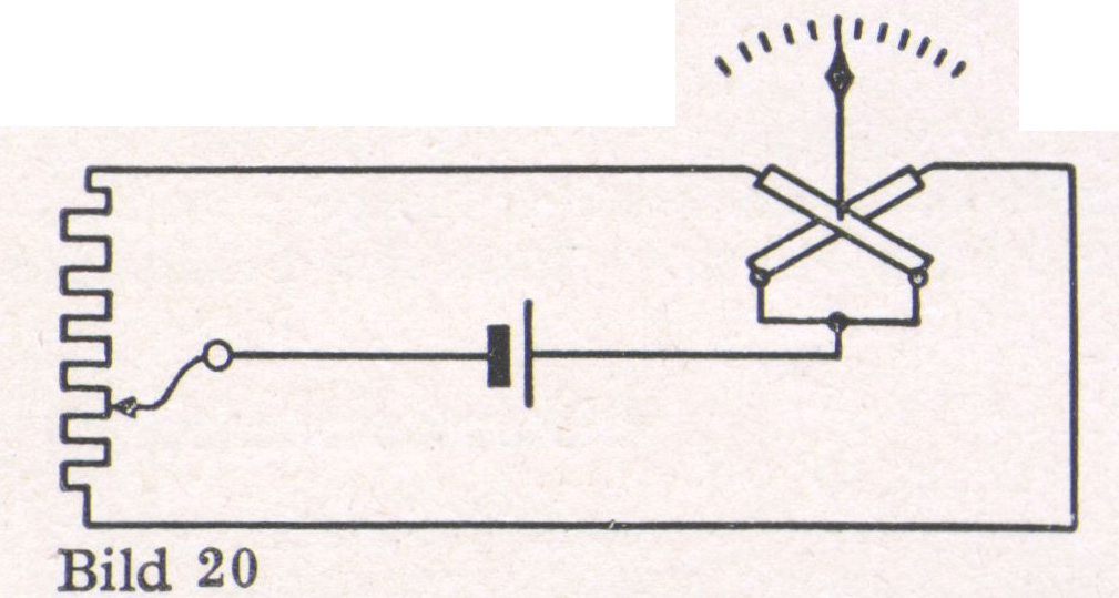 Der Stromverlauf ist aus Bild 20 ersichtlich. Der Meßstrom fließt von der Batterie zur Schleifbürste, teilt sich dort in die beiden Widerstandsabschnitte der Fernsenderwalze und fließt durch die beiden Fernleitungen zu den beiden Spulen des Kreuzspulgerätes; eine gemeinsame Rückleitung führt zurück zur Batterie.