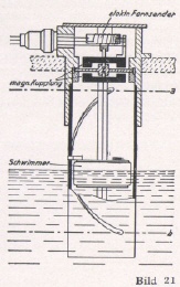 Bei der Fernübertragung des Flüssigkeitsstandes ist eine Schwimmervorrichtung erforderlich, durch die die Änderungen des Standes in eine Drehbewegung umgesetzt werden. Bild 21 zeigt eine solche Vorrichtung zur Vorratsmessung explosibler Flüssigkeiten, z. B. des Brennstoffes in Flugzeugen. Der Schwimmer im Tauchrohr gleitet, je nach der Höhe des Flüssigkeitsspiegels, auf und ab. Bei dieser Bewegung wird er durch eine seitliche Führungsrolle gedreht, die in einen spiralförmig verlaufenden Schlitz des Tauchrohres geführt ist. Die Drehung des Schwimmers überträgt sich auf die Mittelachse, die am oberen Ende den treibenden Teil einer magnetischen Kupplung trägt. Darüber liegt, durch eine unmagnetische Wand vollkommen abgedichtet, der getriebene Teil der magnetischen Kupplung, mit dem der Fernsender starr gekuppelt ist.