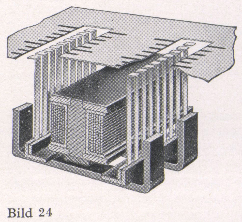 Bild 24 zeigt das Meßwerk nach Hart- mann-Kempf. Dieses besitzt eine Anzahl abgestimmter Stahlzungen, die in Reihe vor einem Elektromagneten angeordnet sind. Fließt Wechselstrom durch die Magnetspule, so wird diejenige Zunge in Schwingung versetzt, deren Eigenschwingungszahl gleich der Polwechselzahl, d.h. der doppelten Frequenz des Wechselstromes ist. Wird der Elektromagnet durch Überlagerung eines Gleichfeldes, das mindestens so groß ist wie der Scheitelwert des Wechselfeldes, vormagnetisiert, so wird die Zunge nicht mehr bei jedem Polwechsel, sondern nur von jeder positiven Halbwelle angezogen.