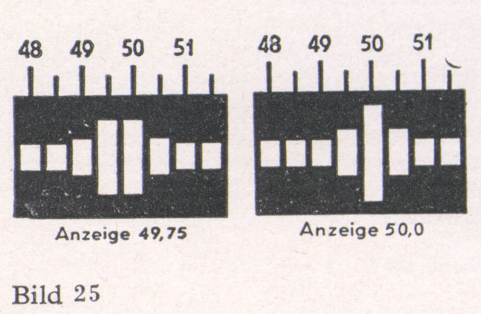 Die Ablesung eines Zungenfrequenzmessers wird durch Bild 25 erläutert. Im rechten Bild ist die Frequenz des Wechselstromes genau 50 Hz; die beiden benachbarten Zungen schwingen nur wenig mit und zwar mit gleicher Amplitude. Im linken Bild schwingen die beiden Zungen 49,5 und 50 mit gleicher Schwingungsweite; der gesuchte Wert liegt also genau in der Mitte bei 49,75. Durch entsprechende Überlegung lassen sich alle Zwischenwerte gut schätzen.
