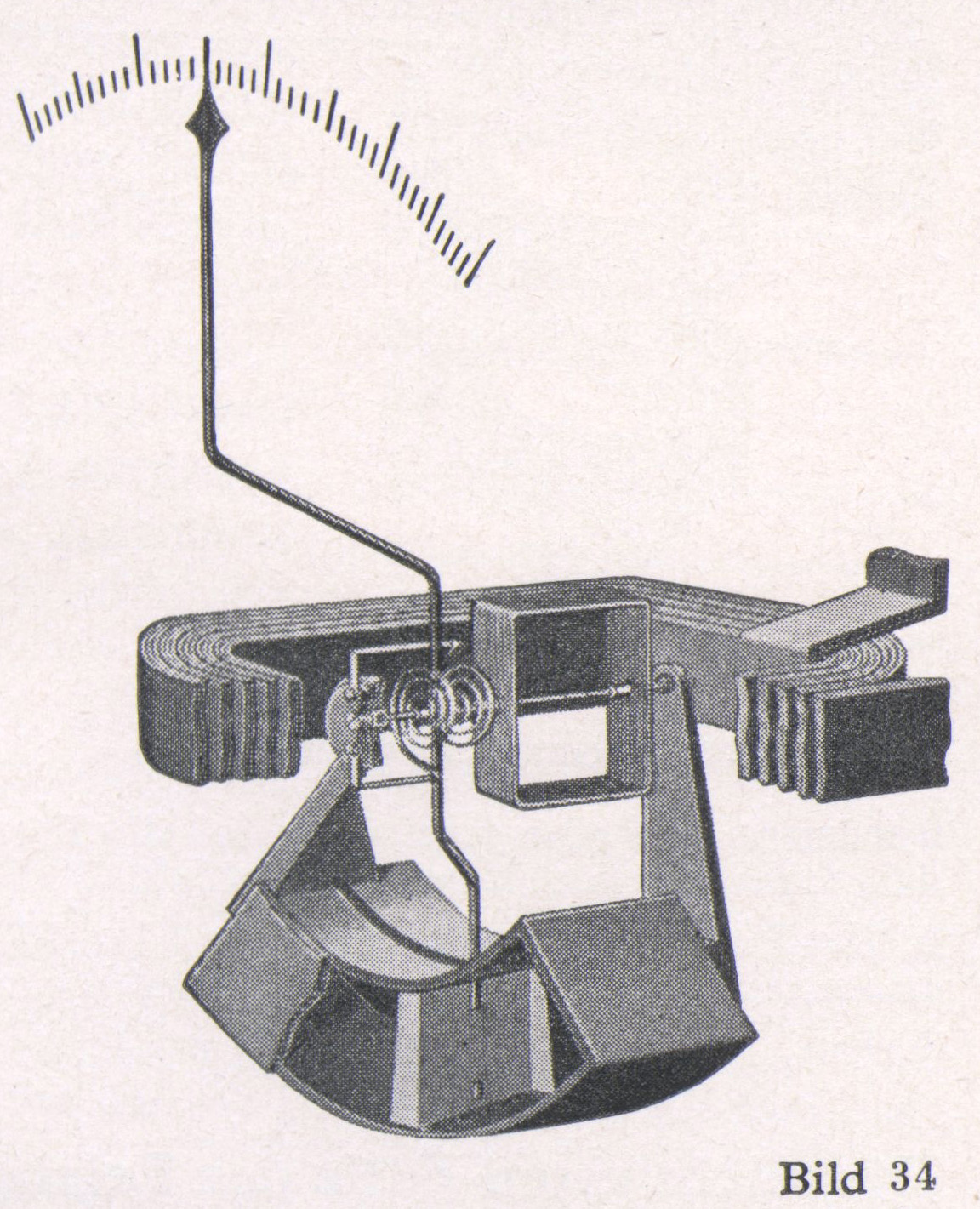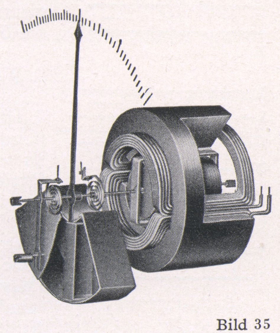 Bei Präzisions-Geräten für genaue Messungen wird das eisenlose Meßwerk bevorzugt (Bild 34), das bei Gleich- und Wechselstrom bis zu einigen hundert Hertz und bei allen Kurvenformen richtig zeigt. Das eisenlose Meßwerk in der einfachen Ausführung nach Bild34 ist nicht unabhängig von fremden magnetischen Feldern; daher wird heute allgemein die astatische Ausführung nach Bild 36 bevorzugt. Bei Betriebs-Geräten wird vorwiegend das eisengeschlossene Meßwerk verwendet (Bild 35). Der Eisenschluß bewirkt stärkeres Drehmoment des Zeigers und schützt gegen den Einfluß fremder Felder. Der Eisenfehler wird durch Wahl besonderer Eisensorten so niedrig gehalten, daß er bei technischen Messungen nicht ins Gewicht fällt.