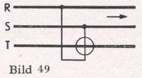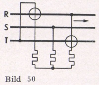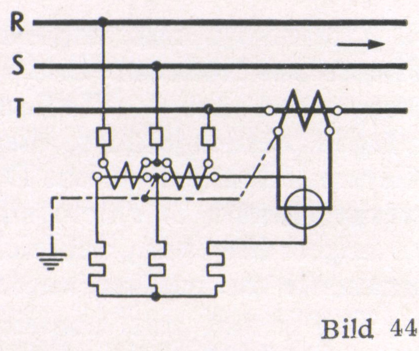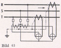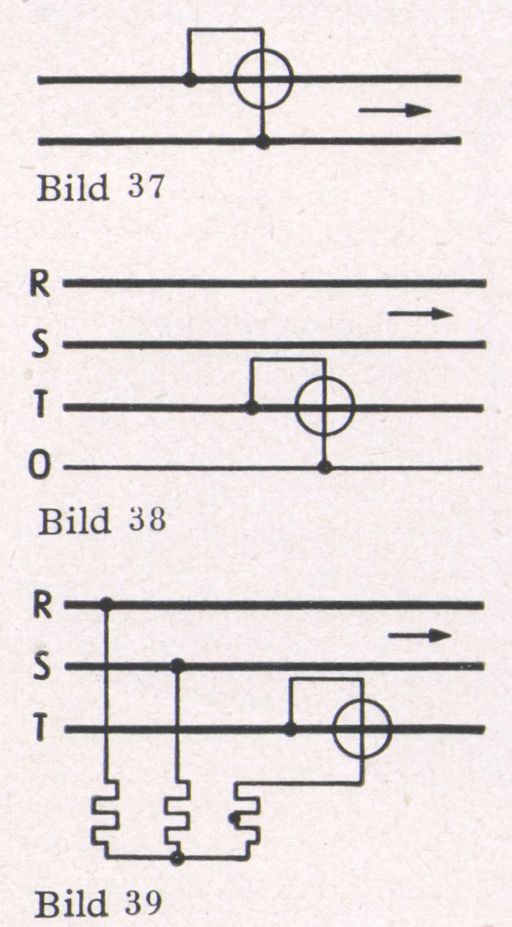 4. Drehstrom mit gleichbelasteten Phasen ohne zugänglichen Nullpunkt (Bild 39). Durch drei in Stern geschaltete Widerstände wird ein künstlicher Spannungs- Nullpunkt gebildet und dann wie unter 3. gemessen.