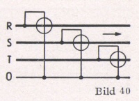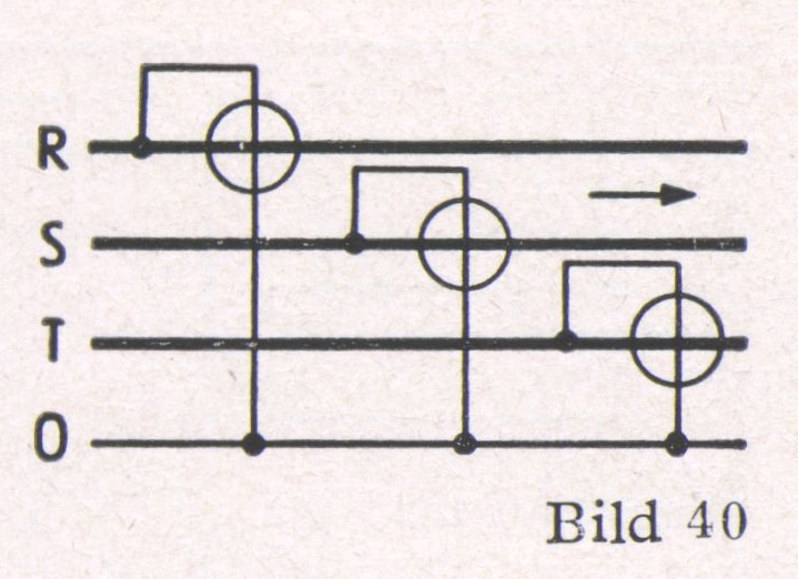 5. Drehstrom mit ungleich belasteten Phasen mit Nulleiter (Bild 40). Die Messung wird auf 3 Wechselstrom-Messungen zurückgeführt, die addiert die Gesamtleistung ergeben. Die drei Meßwerke können in einem einzigen Gerät so angeordnet sein, daß sich ihre Drehmomente mechanisch addieren.