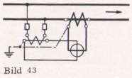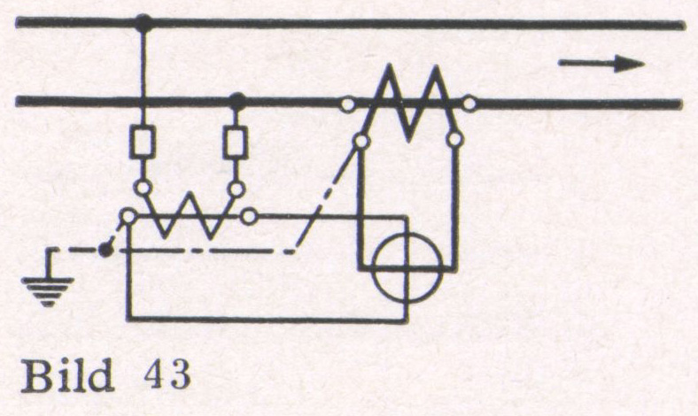 Bei Phasenverschiebung über 60° zeigt bei Schaltung nach Bild 41 (bei Verwendung von zwei Geräten) einer der beiden Leistungsmesser einen negativen Ausschlag. Durch Vertauschen der Spannungsanschlüsse wird dieser positiv und ist dann vom Ausschlag des anderen Gerätes zu subtrahieren. — Bei Messungen an Netzen mit Erdschluß verliert die Zwei-Leistungsmesser-Methode an Genauigkeit. Bei genauen Messungen ist deshalb in Zweifelsfällen die Messung mit drei Leistungsmessern nach Bild 10 vorzunehmen; die dort am Nulleiter angeschlossenen Spannungsleitungen werden hier zu einem künstlichen Nullpunkt zusammengeschlossen. Dabei ist Voraussetzung, daß die Widerstände der 3 Spannungspfade gleich groß und für die Sternspannung bemessen sind.