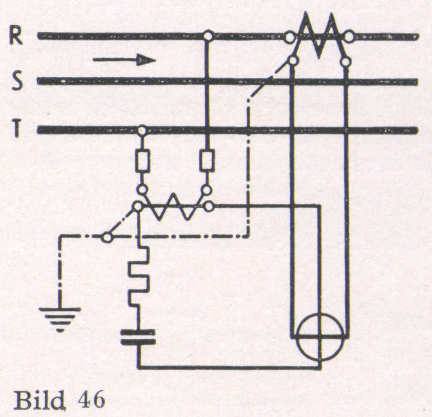 Bei Drehstrom mit gleichbelasteten Phasen kann durch Schaffung einer Kunstphase im Meßgerät ein Wandler eingespart werden. Die Messung ist dann jedoch nur bei einer bestimmten Frequenz richtig (Bild 46).