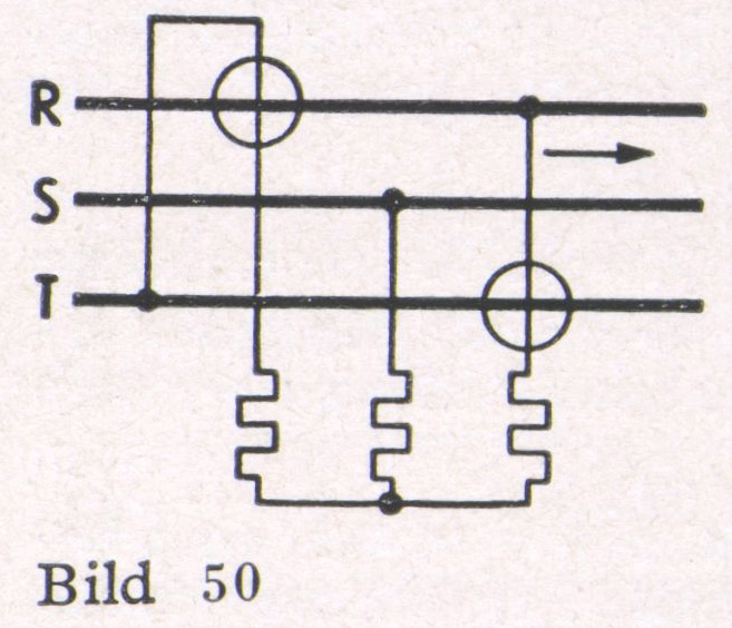 2. Ungleichbelasteter Drehstrom ohne Nulleiter (Bild 50). Die Messung ist bei dieser Schaltung nur dann richtig, wenn die drei Spannungen des Drehstromnetzes gleich sind. Im allgemeinen genügt die erreichbare Genauigkeit für Betriebsmessungen.