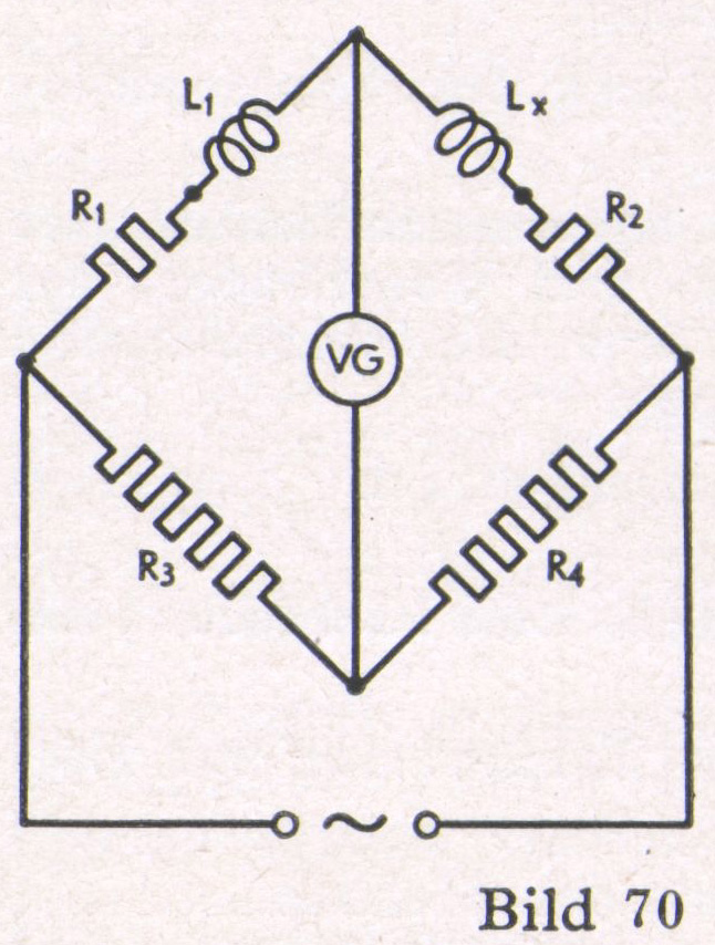 In Bild 70 ist L1 eine bekannte, Lx die unbekannte, zu messende Selbstinduktion, R1 ... R4 sind induktions- und kapazitätsfreie, regelbare Widerstände, VG ist ein Vibrations-Galvanometer. Die Brücke wird von Wechselstrom gespeist.