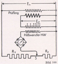 Der Transformator wird oberspannungsseitig erregt; parallel zur Oberspannungs-Wicklung liegt ein Spannungsteiler. Die Unterspannung des Transformators wird unter Zwischenschaltung eines vielfach angezapften Hilfswandlers gegen eine am Spannungsteiler abgegriffene Teilspannung kompensiert. Als Nullgerät dient dabei ein Drehspulgerät mit Trocken - Gleichrichter. Unter Berücksichtigung des gewählten Übersetzungsverhältnisses des Hilfswandlers ist dann das Verhältnis am Spannungsteiler ein Maß für das Leerlauf-Übersetzungsverhältnis des Prüflings.