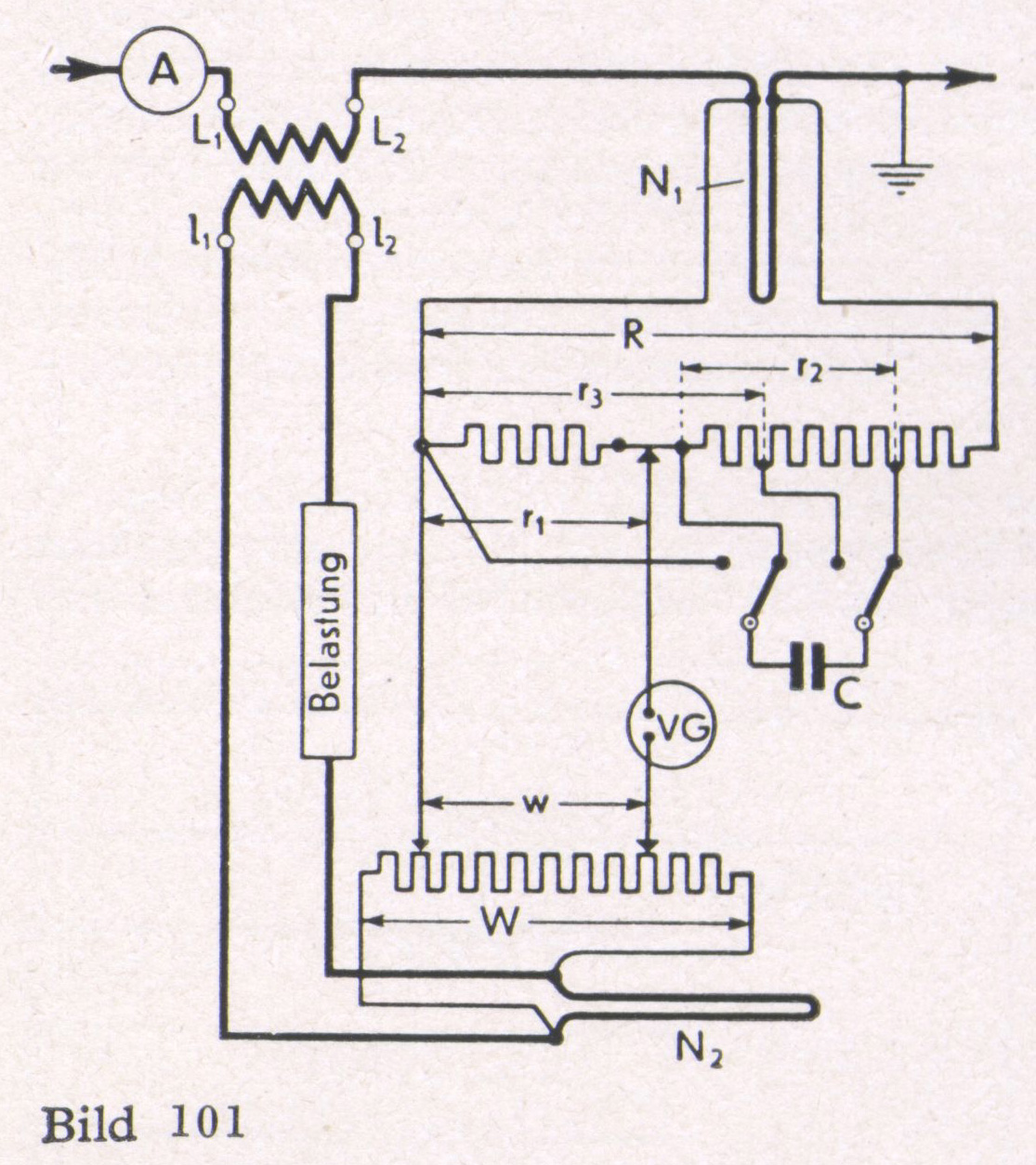 Der Primärstrom I1 des zu prüfenden Stromwandlers durchfließt den Strommesser A und ein Widerstandsnormal N1 Der Sekundärkreis ist über eine Belastung und das Widerstandsnormal N2 geschlossen und wird vom Strom I2 durchflossen. Parallel zu N1 und N3 liegen die Spannungsteiler R und W, außerdem parallel zu einem Teilwiderstand von R die Kapazität C. Das Verhältnis W : w wird entsprechend dem Übersetzungsverhältnis des Prüflings eingestellt. Als Nullgerät dient ein Vibrations- Galvanometer VG. Die Kompensation der Spannung erfolgt durch den Regelwiderstand r1, die der Phasenlage durch den regelbaren Kompensator C. Das Vibrations- Galvanometer zeigt erst Null, wenn sowohl Spannung als auch Phase kompensiert sind. Der Stromfehler kann unmittelbar am Regelwiderstand rt abgelesen werden, während die Stellung des regelbaren Kompensators C ein Maß für den Fehlwinkel ist.
