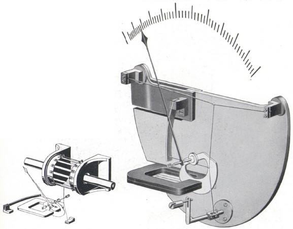 Dabei bewegt sich eine auf der Achse befestigte Aluminiumscheibe im Feld eines Dauermagneten und bewirkt schwingungsfreie Einstellung des Zeigers.