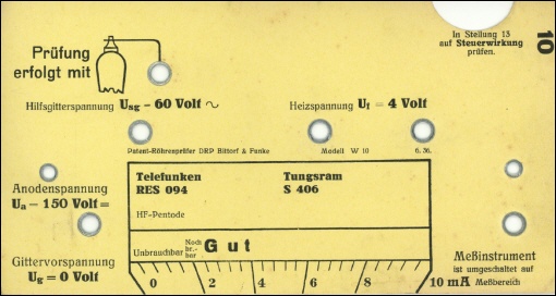Prüfkarten Die Prüfkarten haben eine Abmessung von ca. 198 x 105 mm, sind gelocht (teilweise noch mit Metallösen) und mit einer runden Aussparung für das Messwerk ausgestattet. Die Karten besitzen eine Skala, die den oberen Teil des Messwerks überdeckt und mit "Unbrauchbar", "Noch brauchbar" und "Gut" beschriftet ist. Neben der mit der Karte zu prüfenden Röhrentypen sind auch die Prüfparameter (Anodenstrom, Anodenstrom-Messbereich, Hilfsgitterspannung und Heizspannung) aufgelistet. Alle Karten sind nummeriert und besitzen eine Aussparung (oder sonstiger Kennzeichnung) für die zu nutzende Röhrenfassung.