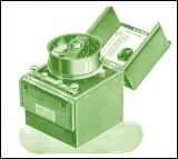 | Stromindicator mit Sicherung und Ausschalter von H. Bohm .Der Apparat besteht im wesentlichen aus einem Elektromagnet, vor dem ein drehbar gelagerter Anker schwingen kann. Ist der Elektromagnet stromlos, so verschwindet der rot angestrichene Anker hinter einem Schirm, erscheint aber, wenn der Strom den Elektromagneten umfließt. Der Apparat wird in Bogenlicht-Stromkreise eingeschaltet und läßt erkennen, ob die betreffende Bogenlampe richtig funktioniert. Der Apparat ist noch mit einer Bleisicherung und einem Momentschalter versehen.