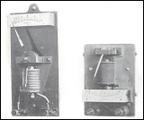 | Spannungswecker von C. Hoffmann.Der Apparat besteht, ähnlich wie bei dem Steuerapparat Nr. 115, aus einem Relais, das zwei elektrische Wecker mit verschieden abgestimmten Glocken in Tätigkeit setzt. Bei zu großer Spannung ertönt die große, bei zu kleiner Spannung ertönt die kleine Glocke.