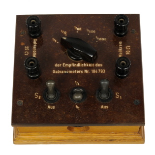 Das Gerät hat vier Anschlüsse, links wird das Galvanometer angeschlossen, rechts die Stromquelle. Der Innenwiderstand des Geräts zum Galvanometer ist konstant 25 Ohm. Über den Drehschalter wird der Eingangswiderstand zur Stromquelle von 75 Ohm bis ca. 0 Ohm in 5 Stufen geregelt. Einstellbar sind: 1/1, 1/10, 1/100, 1/1000, 1/10000