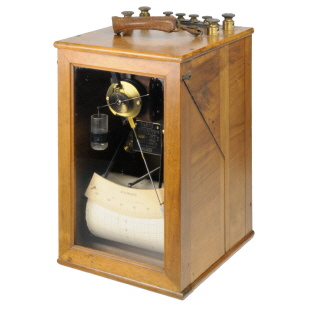 Das Messwerk ist in einem Holzgehäuse eingebaut, deren vorderer Teil inklusive Sichtglas abgenommen werden kann. Das Messwerk selbst besteht aus einem kräftigen Elektrodynamischen Meßwerk. Die Dämpfung erfolgt durch ein am Messwerk befestigten Plättchen, das in einem kleinen Becher bewegt wird (Die ursprüngliche Füllung des Bechers ist unbekannt, möglich wären Wasser, Öl oder Quecksilber). Der Zeiger, aus Aluminium gefertigt, wird oben in die Messing-Hülse, die direkt am Messwerk sitzt, eingesteckt. Die kleine Messing-Hülse am Zeiger dient zur Ausrichtung des Nullpunkts. Die Farbe wird in einem kleinen Schreibkopf, der drehbar am unteren Ende des Zeigers befestigt ist, eingefüllt. Die Tinte wird über eine dünne Rille außen auf das Papier übertragen. Der Schreiber besitzt einen Uhrwerk-Antrieb, der die große Schreiber-Trommel dreht. Der Mechanismus wird über den Hebel rechts aufgezogen. Die Geschwindigkeit kann zwischen 5 M (Minuten) und 3,4 H (Stunden) eingestellt werden. |