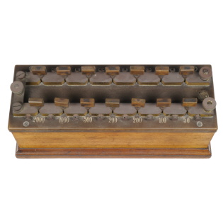 Über 16 Stöpsel lassen sich alle Widerstandswerte zwischen 0 und 4110 Ohm herstellen. Die beiden Widerstandsreihen sind über eine Messingbrücke mit zusätzlichem Abgriff verbunden