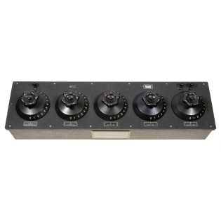 Es handelt sich hier um eine sehr große und massive Ausführung eines Kurbel-Rheostaten. Das Holzgehäuse ist durch Aluminium innen abgeschirmt. Das Gerät besitzt 5 Kurbelschalter mit den Stellungen 0 ... 11. Der Widerstandsbereich lässt sich von 0,1 bis 1222,1 Ohm in 0,1 Ohm Schritten einstellen. |
