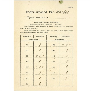 Seriennummer 421766 (auf der Skala, Schild auf Holzsockel und beiliegender Korrektions-Tabelle) |