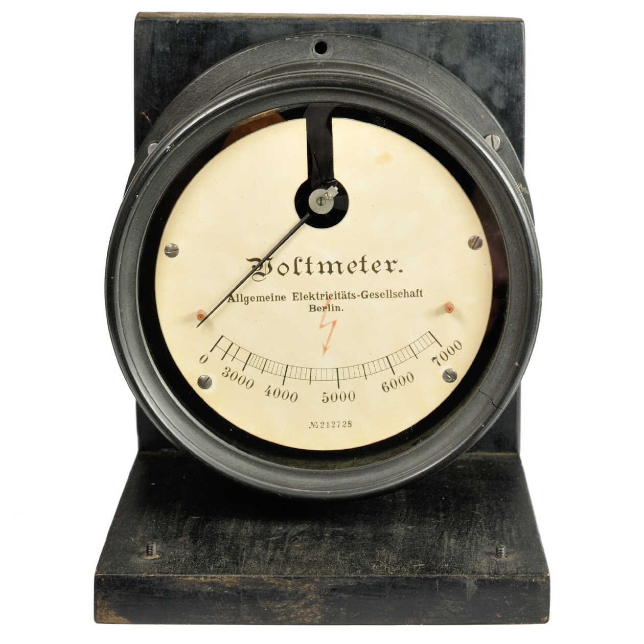 | Beschreibung | Das Messwerk sitzt in einem runden Gehäuse, das vollständig aus Ebonit gefertigt ist. Zwei feststehende, isolierte Flügel aus unbekanntem Material und ein drehbarer Flügel aus Aluminium, an dem auch der Zeiger befestigt ist, bilden das elektrostatische Messwerk. Die Form der Flügel unterscheidet sich wesentlich von andren elektrostatischen Messwerken, die auf der Konstruktion von Lord Kelvin beruhen. Das Gerät besitzt zudem eine Dämpfung. Der Aluminiumflügel bewegt sich im Luftspalt eines seitlich angebrachten Weicheisenmagneten. Die Anschlüsse sind auf der Rückseite herausgeführt, einer führt zu den feststehenden Flügeln, einer zur beweglichen Spule.