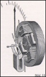 Zur Messung des cos φ bei Wechsel- und Drehstrom wird ein elektrodynamisches Meßwerk verwendet (Bild 53). Dieses besteht aus einer auf der Zeigerachse befestigten, beweglichen Spule und zwei festen Spulenpaaren, von denen jedes aus zwei gegenüberliegenden Spulen besteht.