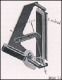 R2, R3 und R4 sind Doppelkurbel-Widerstände mit 10 Stellungen; der Abstand der beiden Schleifkontakte ist fest. R, und R5 sind Einfachkurbel-Widerstände. Bei der Messung wird zunächst der Strom aus der Hilfsstrombatterie Bh mit Hilfe des Strommessers A auf 0,1 mA eingestellt. Dann wird durch Einstellung von R1 ... R5 eine Spannung zwischen A und B abgegriffen, die der Spannung des Normalelementes entspricht (1,0183 V). Da diese Widerstände so bemessen sind, daß die Ziffer der Kurbelstellung gleichzeitig eine Ziffer des Spannungswertes darstellt, sind die Kurbeln von R2, R3, R4 und R5 auf 10, 1, 8, 3 zu stellen (Rt steht auf 0). — Durch den Umschalter wird diese Spannung gegen das Normalelement geschaltet und am Hilfsstromregler nachgeregelt, bis das Galvanometer keinen Ausschlag mehr zeigt. Dann sind beide Spannungen genau gleich und der Hilfsstrom beträgt auf fünf Dezimalstellen genau 0,1000 mA. |