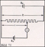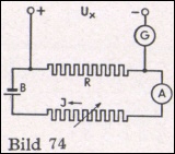 Der Kompensator nach Lindeck-Rothe ist in erster Linie zur Kontrolle der EMK von Thermoelementen bestimmt. Zur Bestimmung der unbekannten Spannung Ux wird der Strom I unter Verwendung des Strommessers A stetig geregelt, bis das Galvanometer G stromlos wird. Die unbekannte Spannung errechnet sich dann aus: U = I. R. Die Fehlergrenze der Messung ist durch die des Strommessers und die des Widerstandes Bild 74 gegeben. |