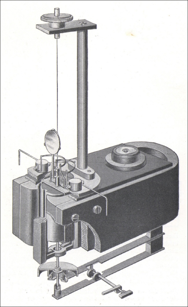 Infolge ihrer großen Empfindlichkeit sind die Drehspul-Meßwerke zum Messen kleinster Gleichstromwerte besonders geeignet. Für solche Fälle wird die Drehspule nicht in Spitzen gelagert, sondern an einem dünnen Metallband aufgehängt, dessen Torsionskraft an Stelle der Spiralfedern dem elektrischen Drehmoment entgegenwirkt. Die Stromzuführung erfolgt dabei durch dünne Metallbänder. Anstatt des Zeigers ist ein kleiner Spiegel mit der Spule fest verbunden, der einen darauf fallenden Lichtstrahl auf eine in beliebiger Entfernung angebrachte Skale zurückwirft. Damit wird die geringste Bewegung der Spule deutlich sichtbar gemacht. Durch Beschwerung der Drehspule und durch Erhöhung des Trägheitsmomentes erzielt man ballistische Ausschläge. |