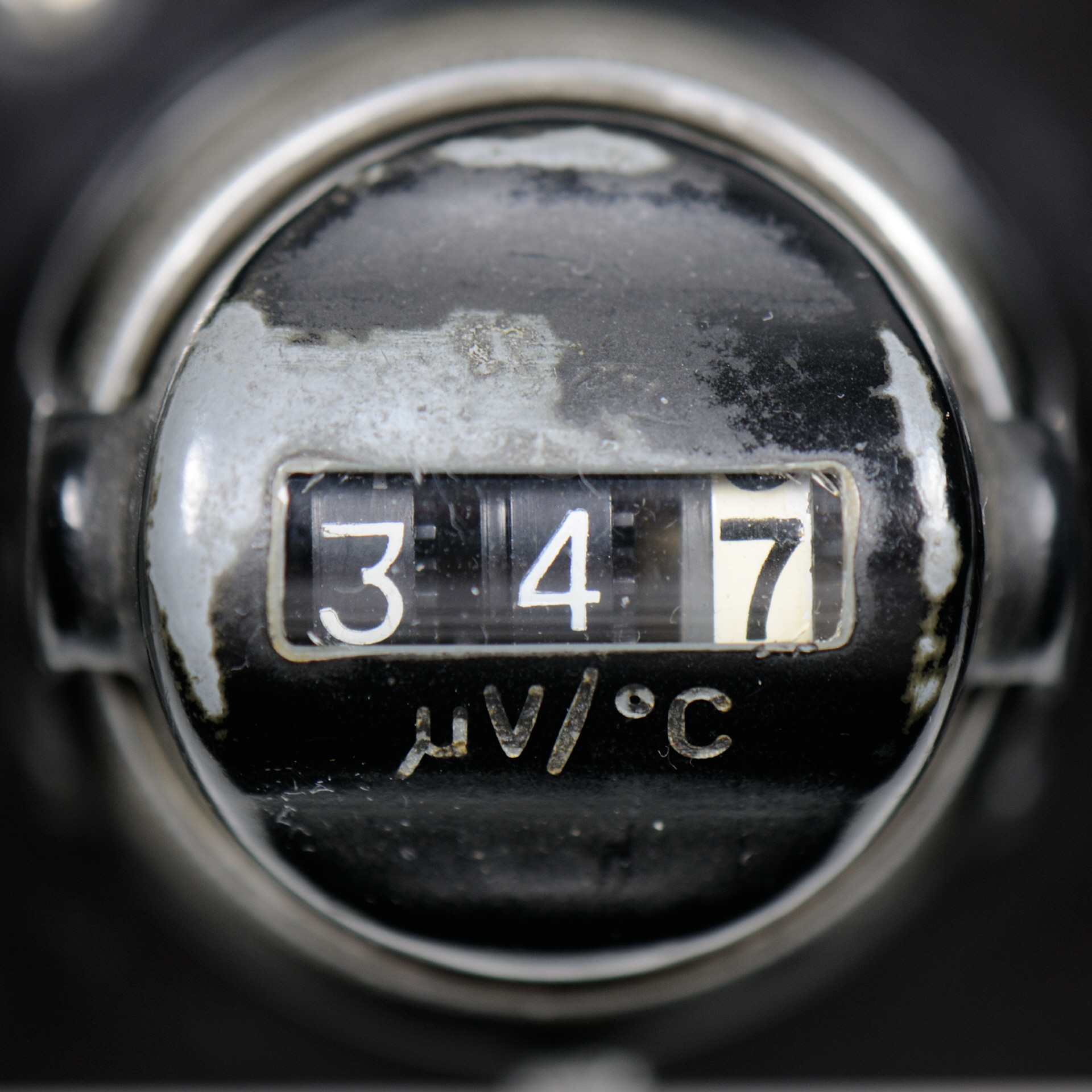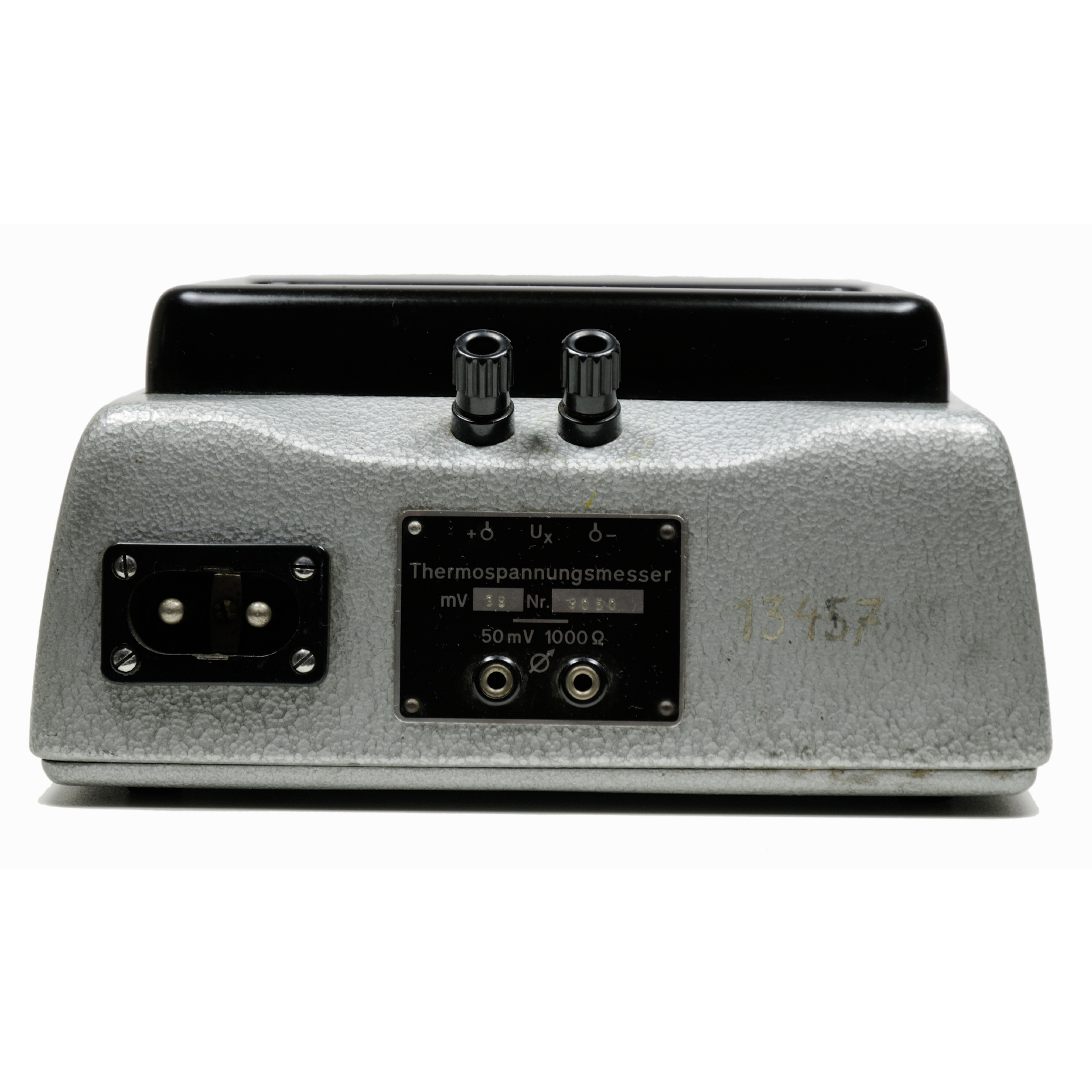 Das Messwerk ist in einem schweren Gehäuse aus Aluminiumguß eingebaut. Die Anzeige erfolgt über ein großes Drehspul-Messwerk (Hersteller Gossen). Neben dem Messbereichsumschalter befindet sich ein Präzisionsregler zur Eichung des Messfühlers, mit einem Einstellbereich von 300 ... 700 µV / °C. Auf der Rückseite finden sich die Anschlussklemmen für den Messfühler und die Stromversorgung. |